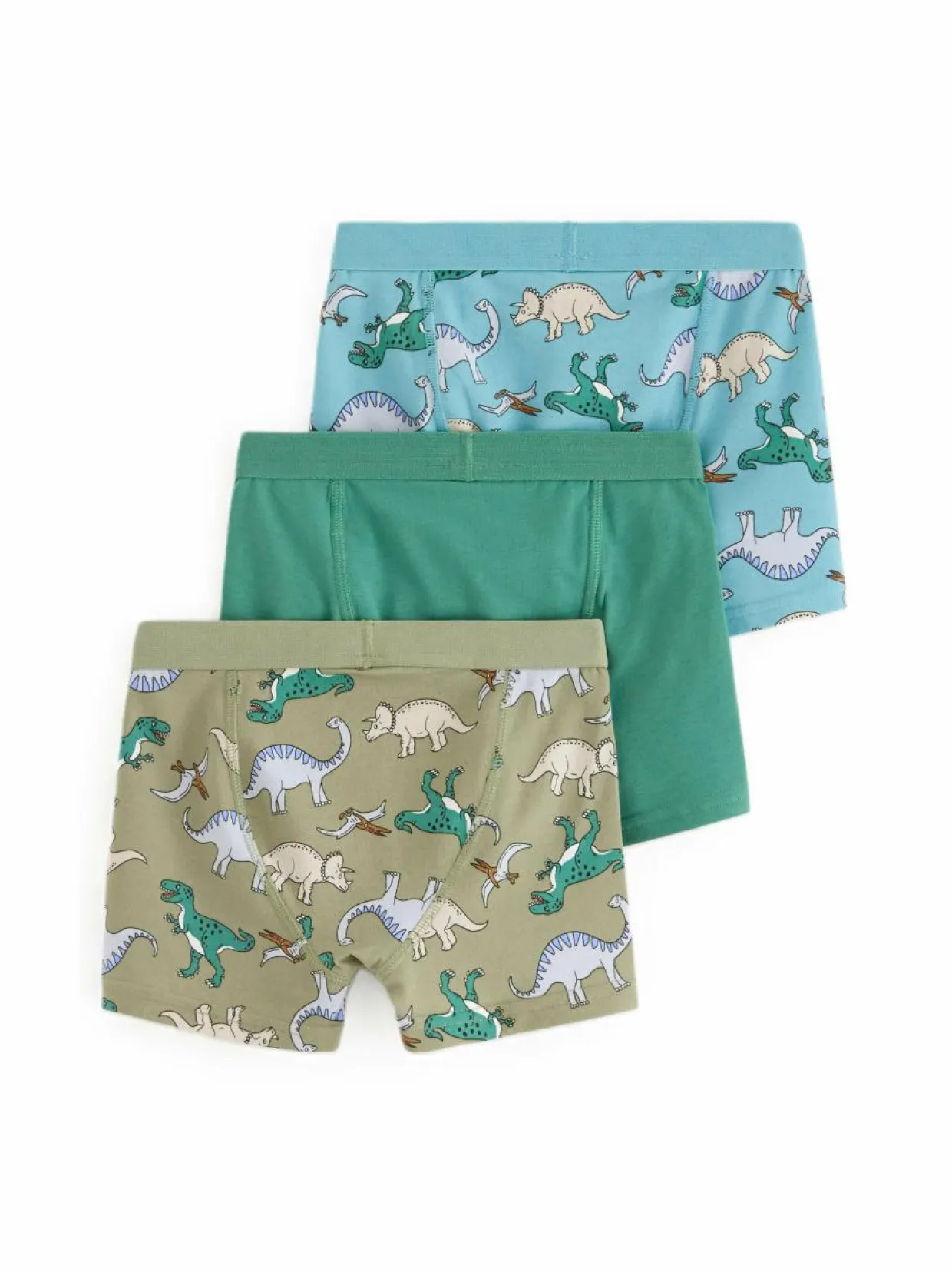 Mukavat ja hengittävät lasten bokserit dinokuosissa. Pakkaus sisältää kolmet alushousut.