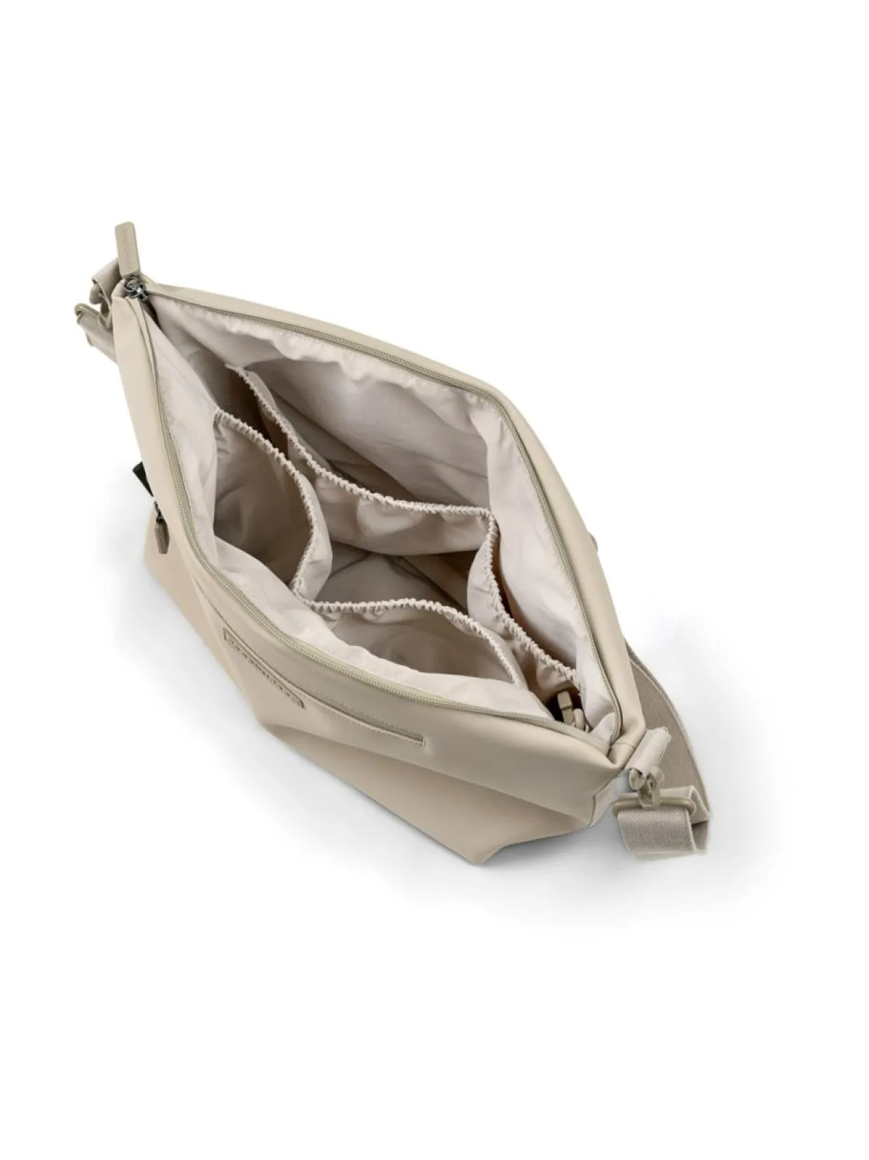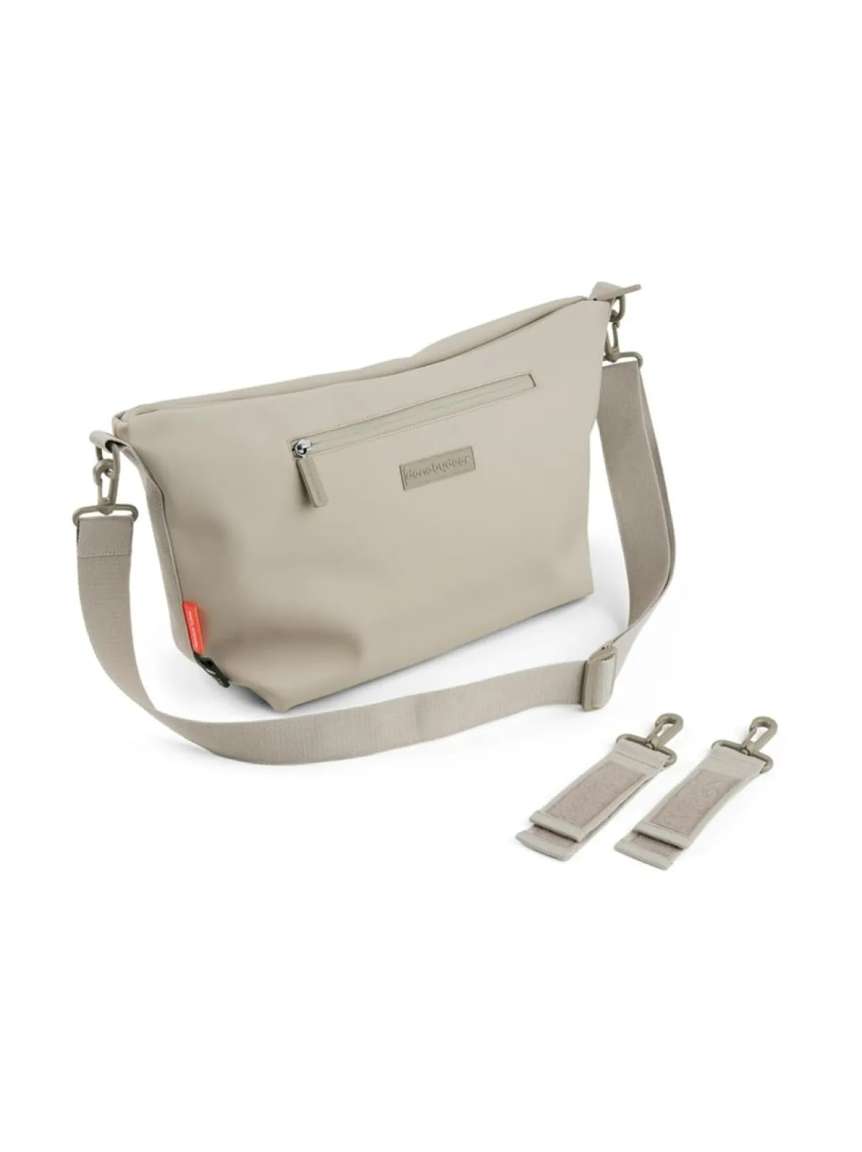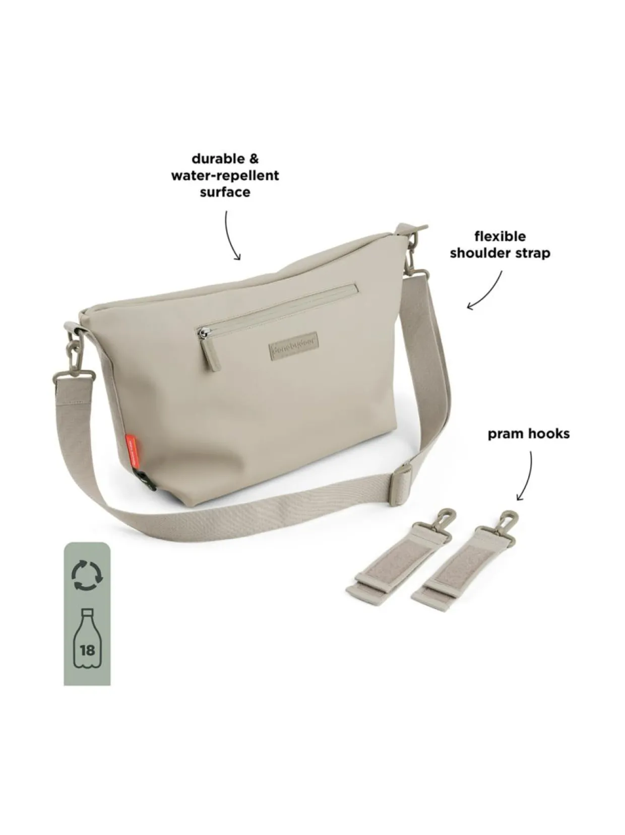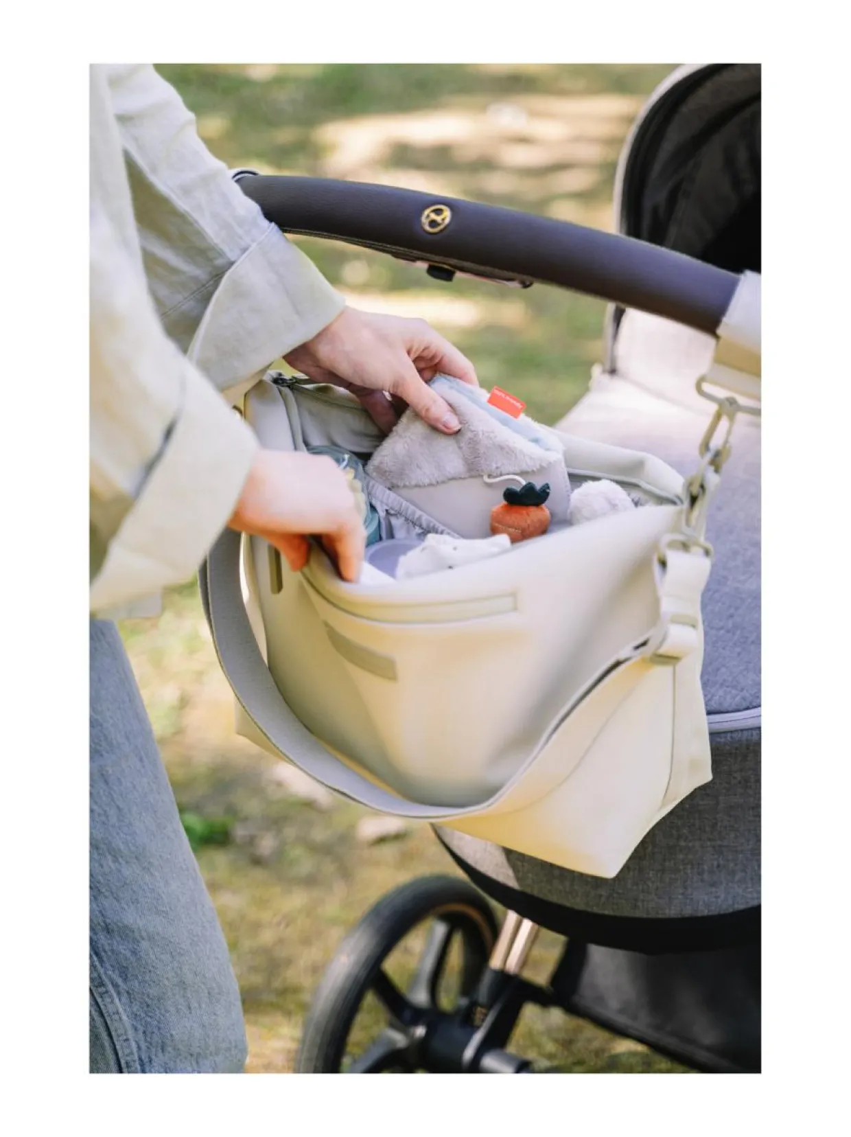 Done by Deer hoitolaukku aisaan on helppo kiinnittää vaunuihin mukana tulevilla hihnoilla. Tyylikäs laukku on valmistettu käyttäen kierrätettyjä muovipulloja. Laukussa on yksi isompi tasku, sekä neljäsisätaskua ja yksi ulkotasku. Laukun olkahihna on joustava ja säädettävä. Lisätietoja: