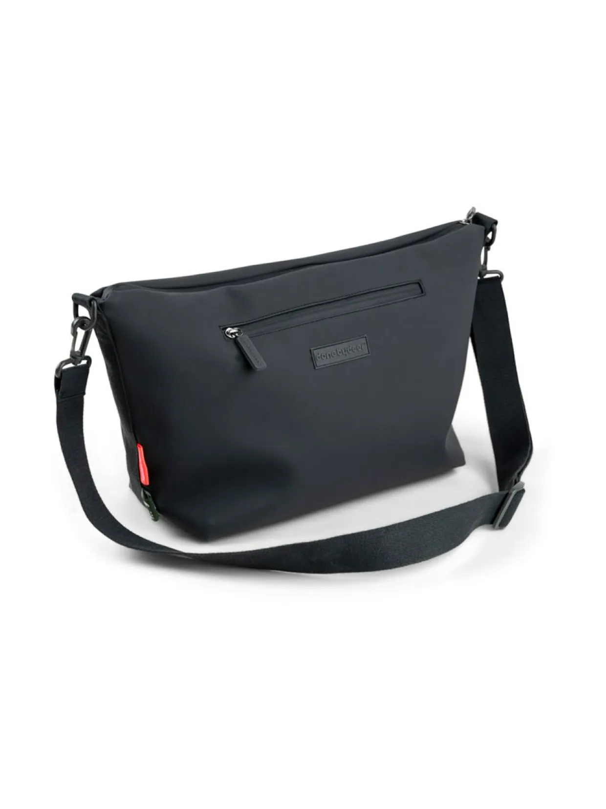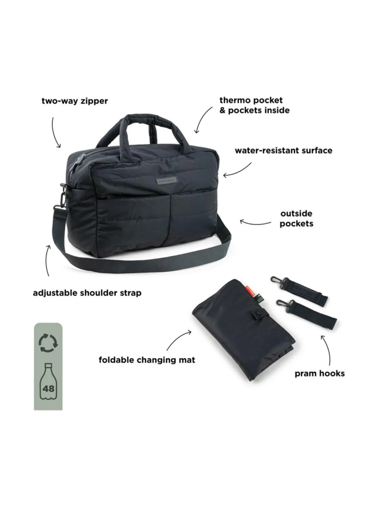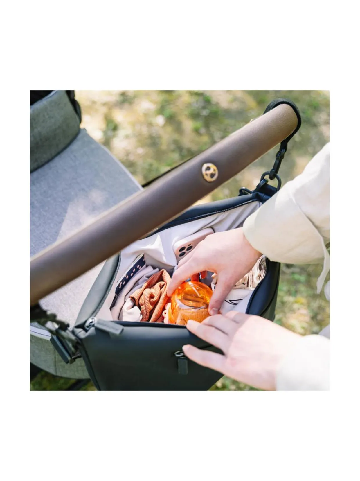 Done by Deer hoitolaukku aisaan on helppo kiinnittää vaunuihin mukana tulevilla hihnoilla. Tyylikäs laukku on valmistettu käyttäen kierrätettyjä muovipulloja. Laukussa on yksi isompi tasku, sekä neljäsisätaskua ja yksi ulkotasku. Laukun olkahihna on joustava ja säädettävä. Lisätietoja: