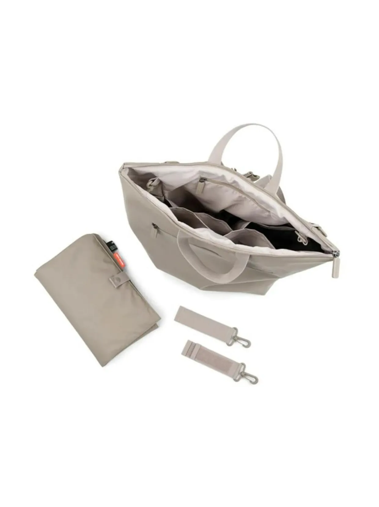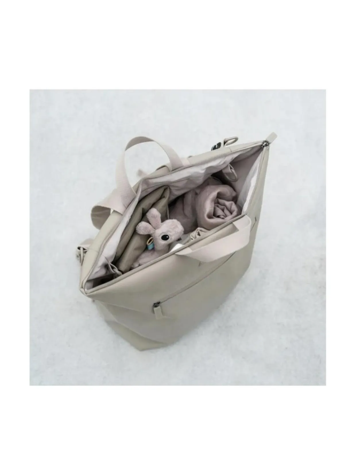 Done By Deer hoitolaukku on tyylikäs ja käytännöllinen. Laukku on valmistettu käyttäen kierrätettyjä muovipulloja. Tilavassa laukussa on seitsemän sisätaskua, sekä vetoketjullinen tasku ulkopuolella. Säädettävien olkainten ansiosta laukkua on mukava kantaa. Hoitolaukkuun kuuluu taitettava ja vedenkestävä hoitoalusta. Lisätietoja: