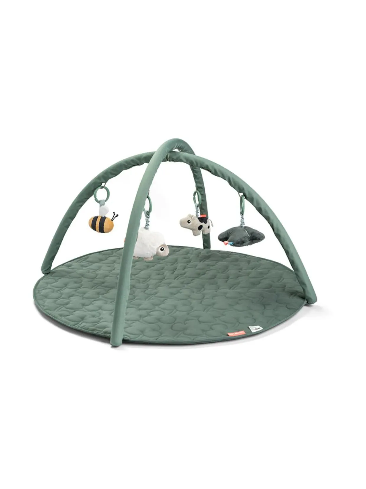 Done by Deer leikkimatto Tiny Farm on tyylikäs leikkimatto, jossa lapsen on mukava maata ja tutkia hänen päällään roikkuvia leluja. Lelujen paikkaa voidaan siirtää eri kohtiin. Leikkimatosta on mahdollista irrottaa myöhemmin kaaret, jotta mattoa voidaan käyttää erikseen.
