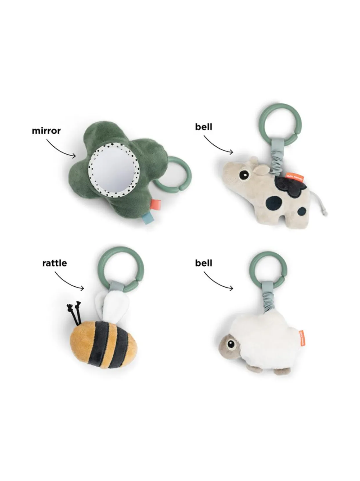 Leikkimatossa on neljä erilaista lelua, kuten vauvaturvallinen peili ja erilaisia helistimiä. Lelut saadaan irrotettua ja niitä voidaan käyttää esim. roikkumassa rattaan kuomussa.