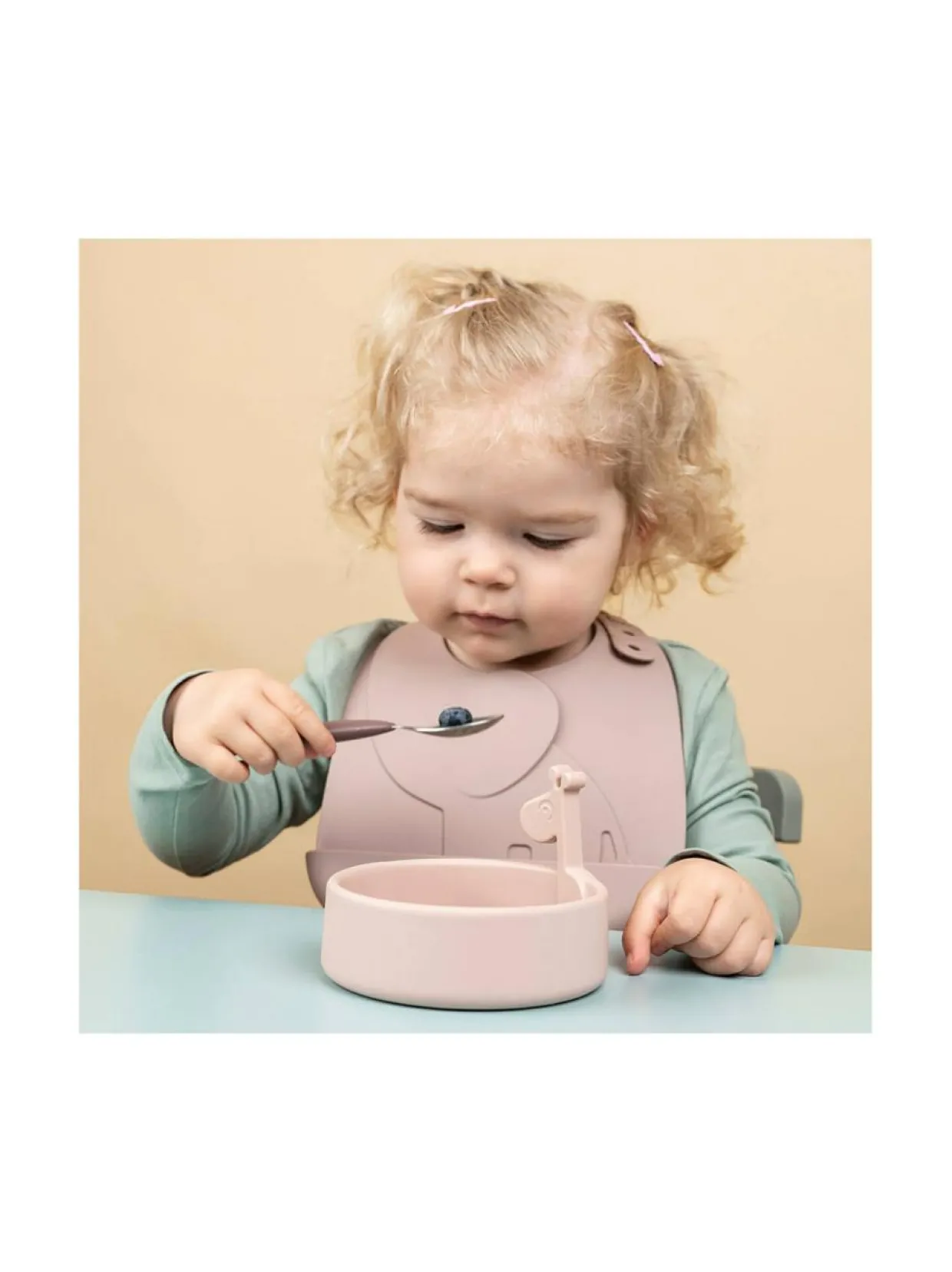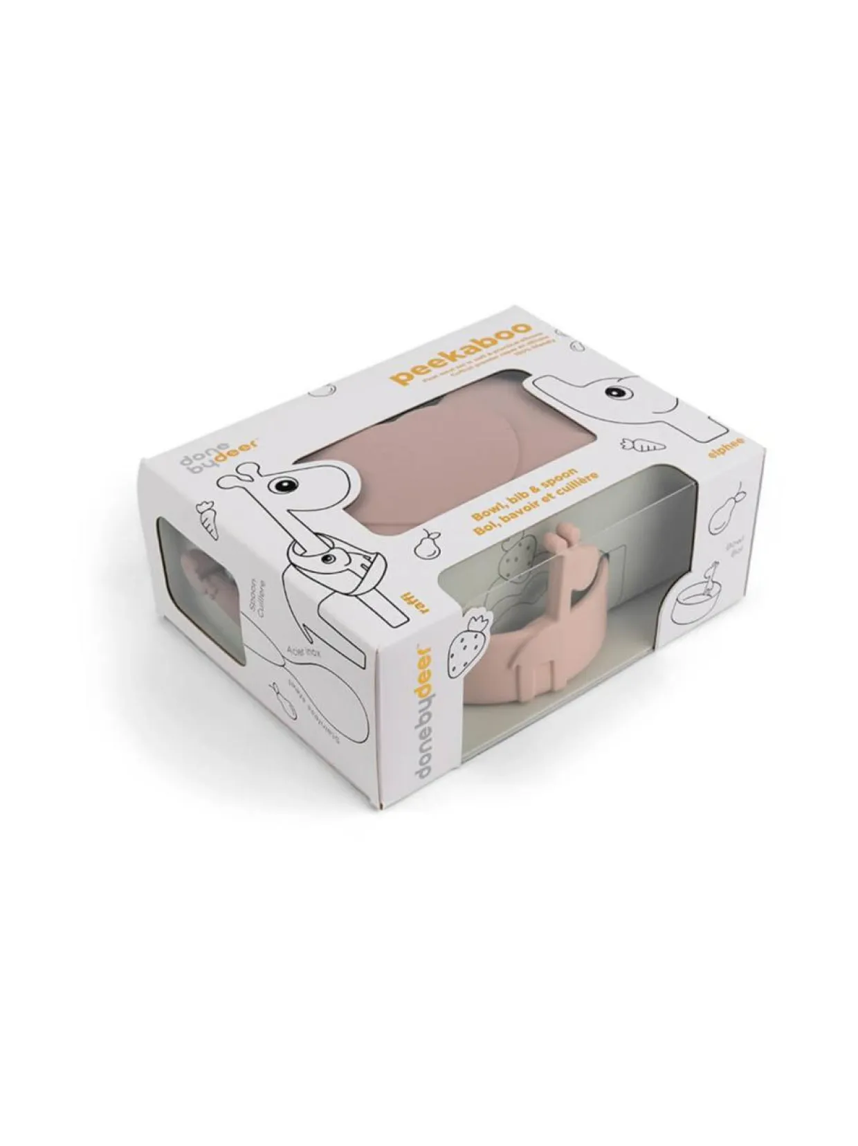 Done by Deer Peekaboo ruokailusetti sisältää suloisen kirahvi kulhon, elefantti ruokalapun ja valas lusikan. Kaikki setin tuotteet ovat hieman erivärisiä, mutta sointuvat toisiinsa. Silikonista valmistetut tuotteet kestävät mahdollista tippumista, antavat kitkaa ja kulhon voi laittaa kätevästi mikroon lämmittämään ruokaa.