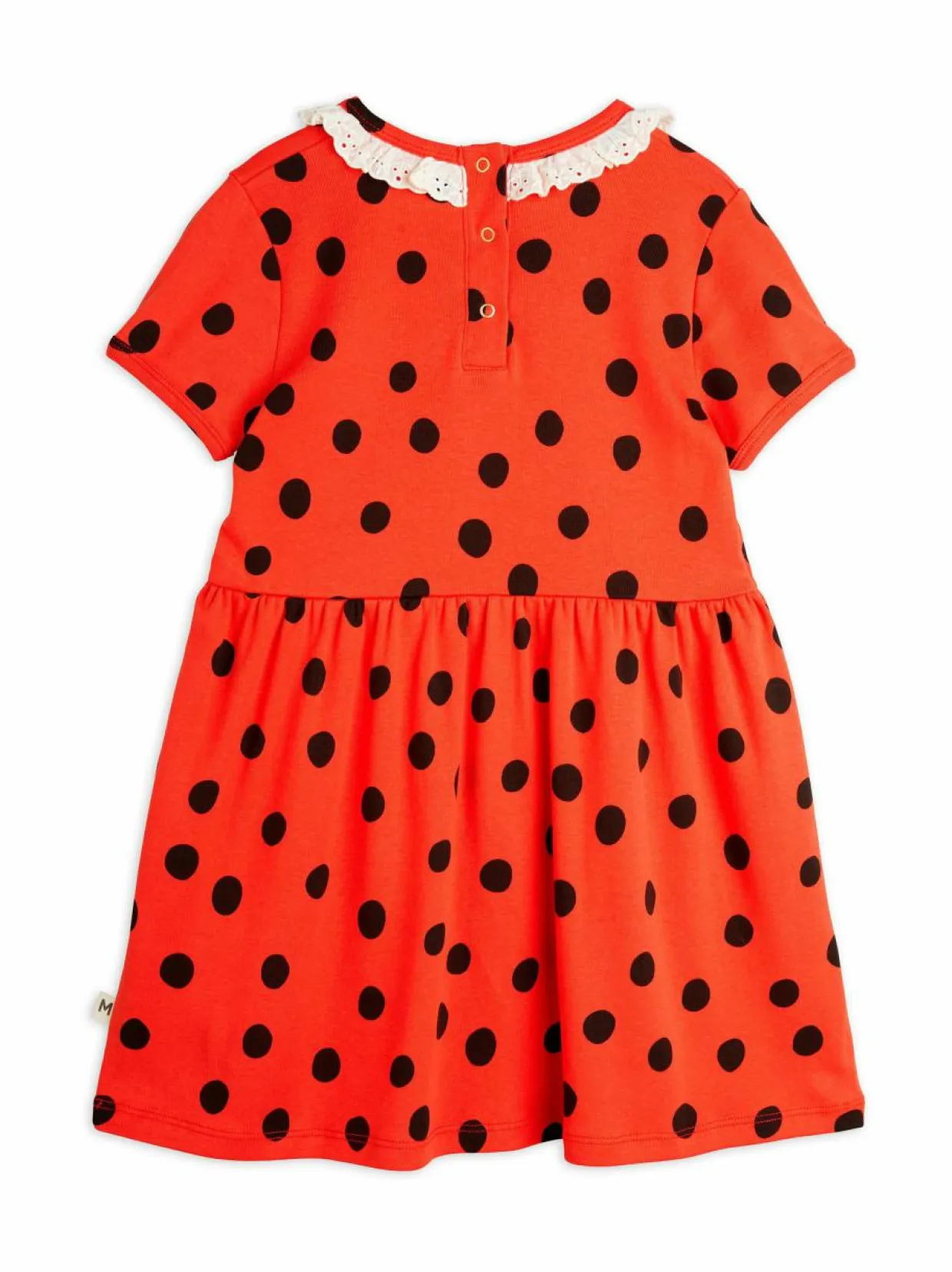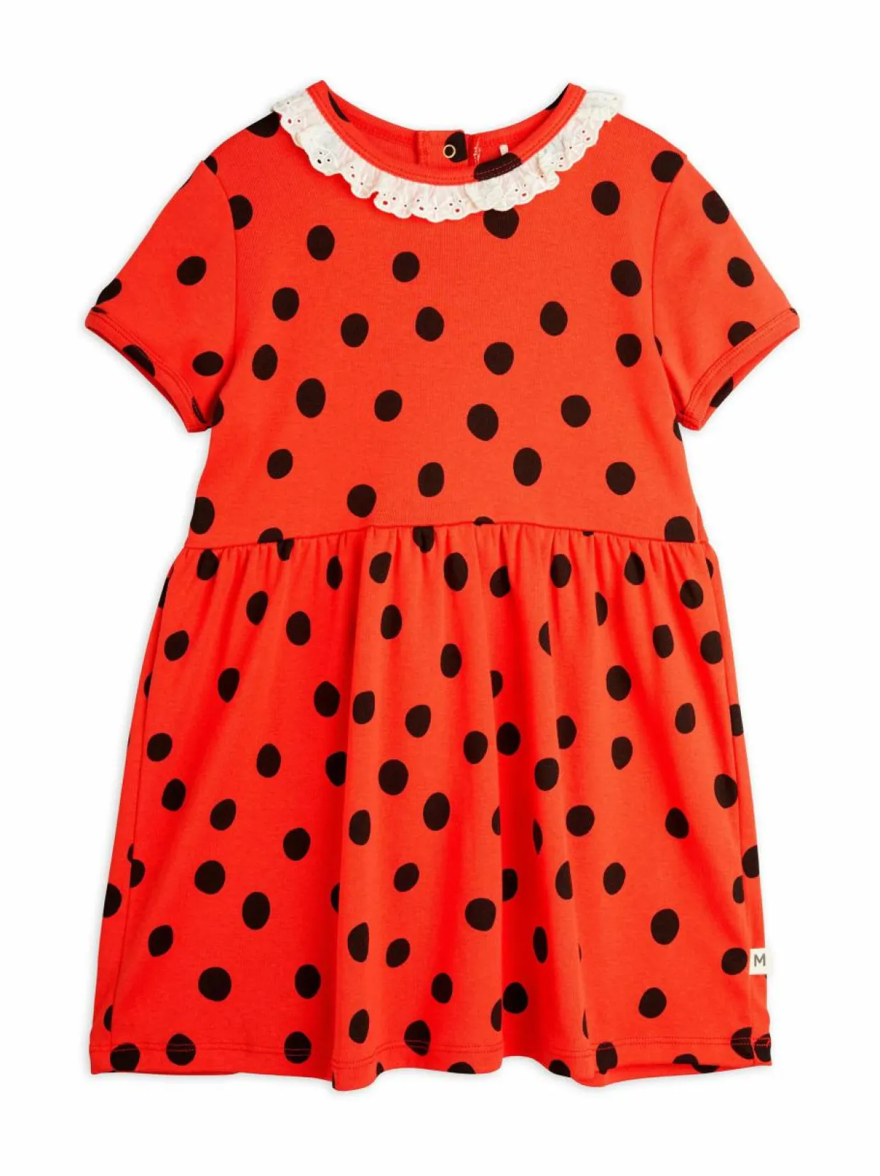 Mini Rodinin lyhythihainen trikoomekko. Mekko on koristeltu pilkkuprintillä ja siinä on A-linjainen laskostettu helma. Materiaali on pehmeän tuntuista ja joustavaa luomupuuvillaa.