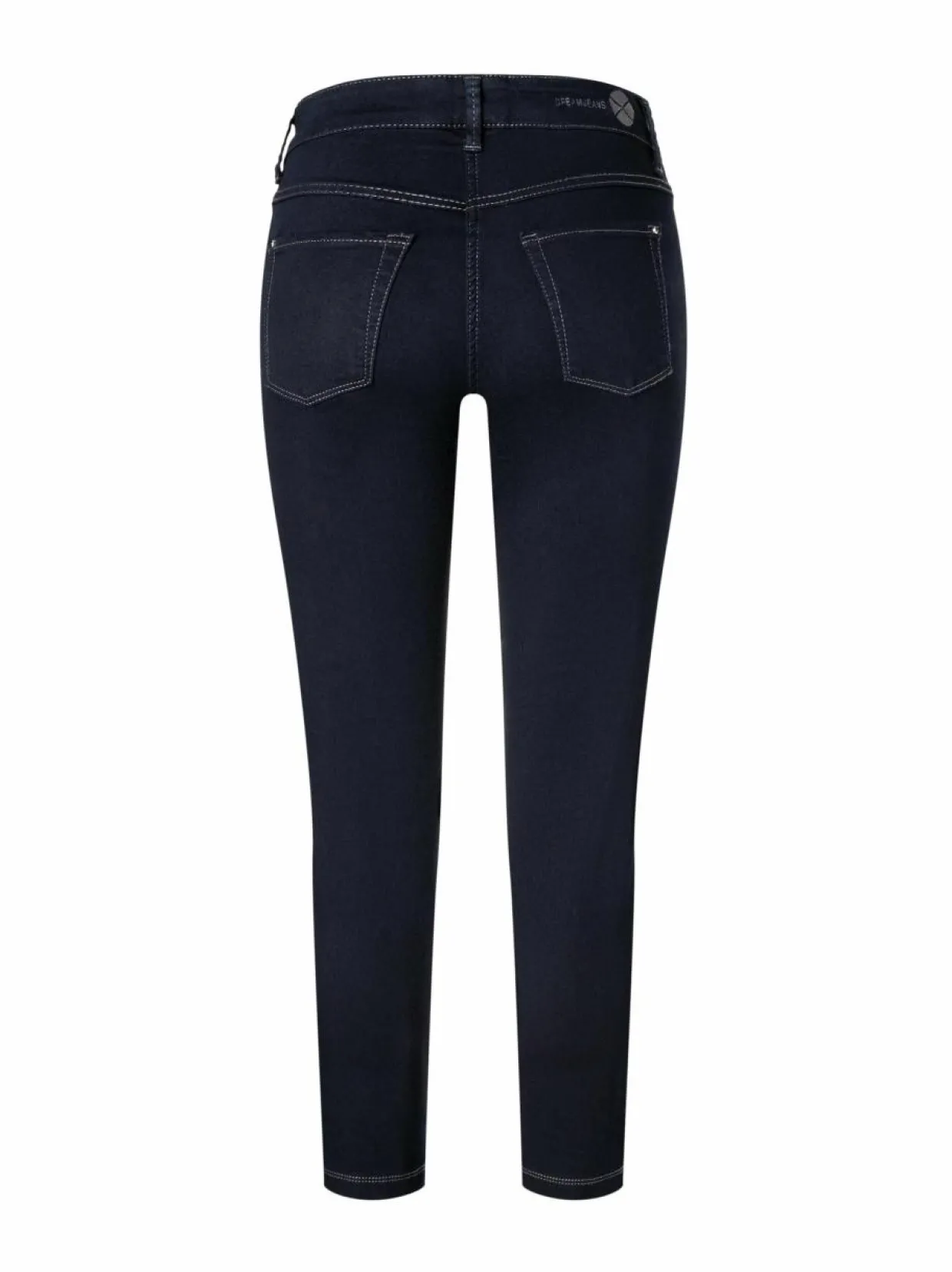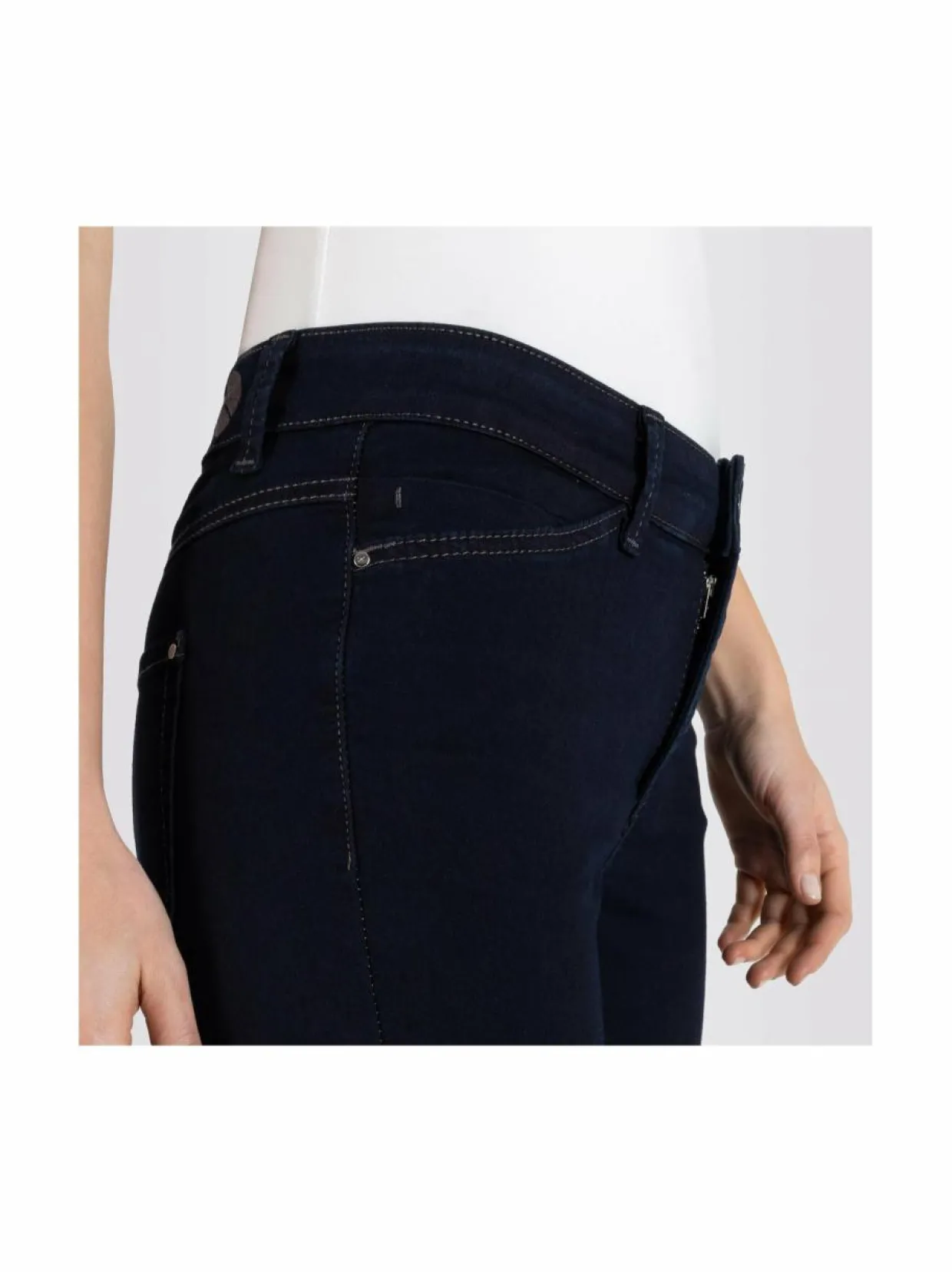 Mac Jeans merkkiset Dream Chic -farkut ovat mukavan joustavaa laatua. Niissä on viistot etutaskut ja kontrastisävyiset tikkaukset. Vyötärökaitaleelta löytyvät vyölenkit. Lahkeet ovat kapeat ja pukevat jalkoja kauniisti. Lahkeensuissa on vetoketjuhalkiot.