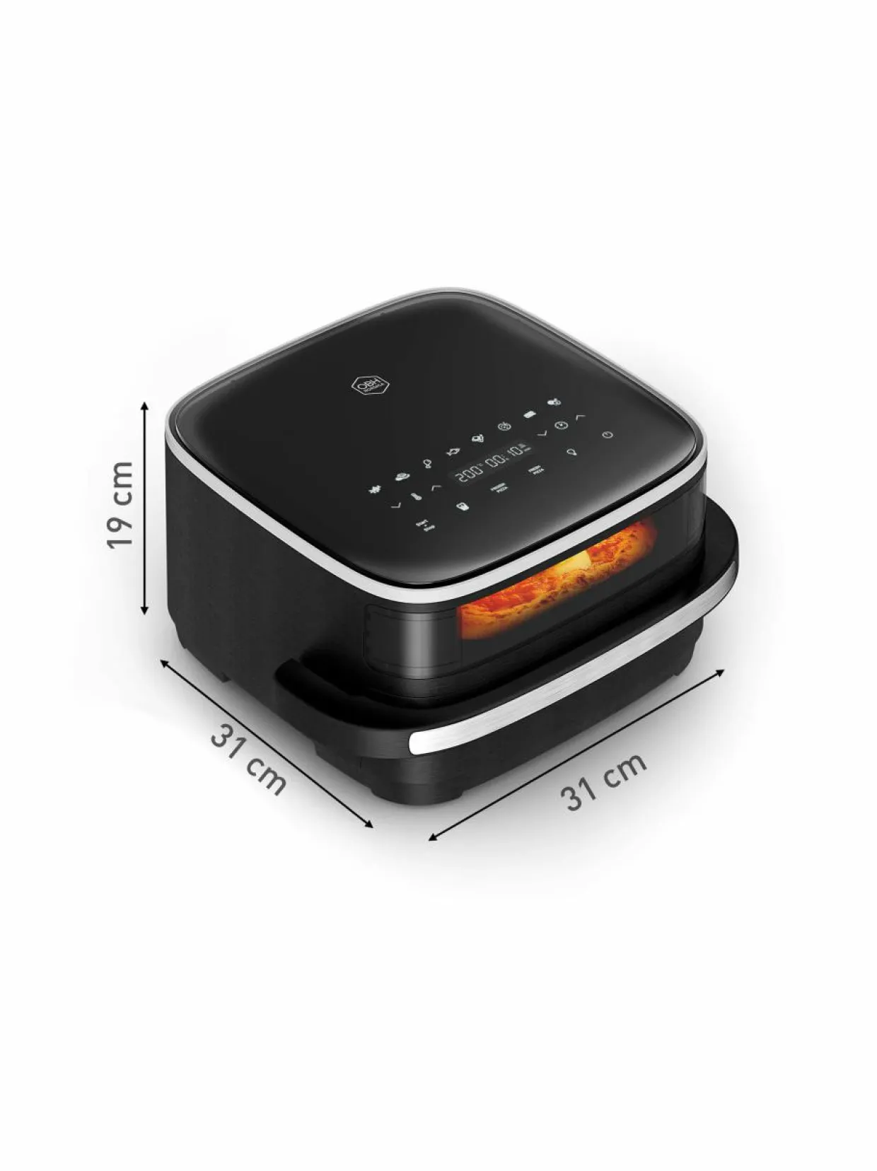 OBH Nordica Easy Fry XL Surface on tyylikäs ja innovatiivisesti muotoiltu, matalaprofiilinen air fryer. Perinteisiin air fryereihin verrattuna Easy Fry XL Surface on huomattavasti matalampi. Sen korkeus on vain 19 cm. Sekä laitteen syvyys että leveys on 31 cm.
