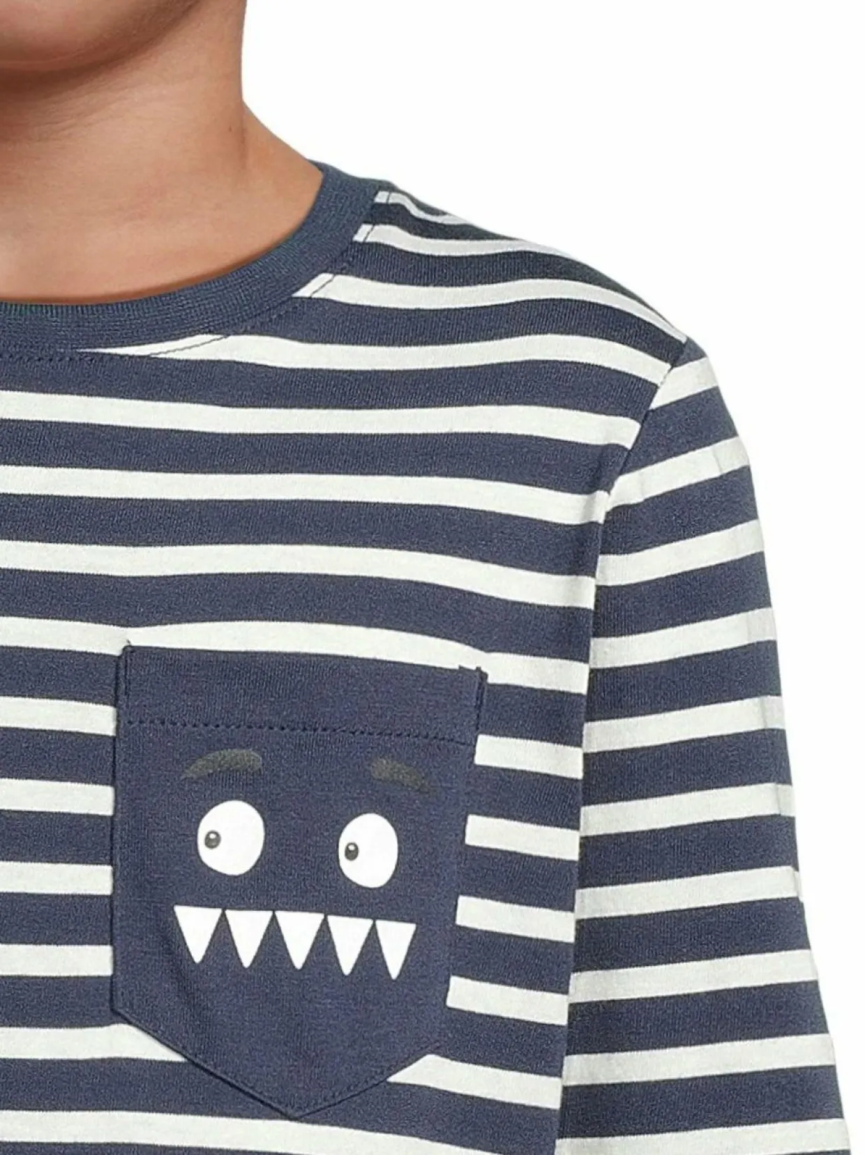 Tämä pitkähihainen trikoopaita on valmistettu laadukkaasta puuvillasta, minkä ansiosta se on ihanan pehmeä ja miellyttävä ihoa vasten. Paidassa on klassinen raitakuosi, jota piristää hauska hirviöaiheinen rintatasku etupuolella. Materiaali on joustavaa ja tuntuu erityisen mukavalta päällä, mikä tekee paidasta täydellisen valinnan niin leikkeihin kuin rentoon oleskeluun.