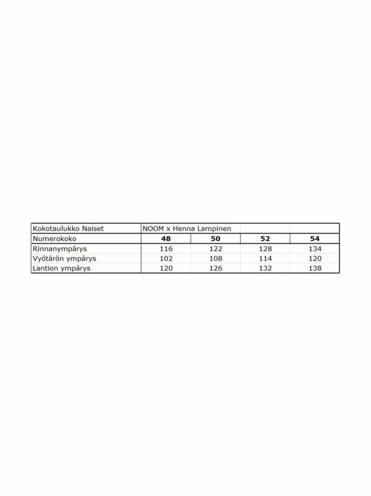 Tehty yhteistyössä Henna Lampisen kanssa, joka on suomalainen vaatesuunnittelija, joka valittiin Vuoden nuoreksi suunnittelijaksi 2023. Hennan suunnittelema pluskokoinen NOOM x Henna Lampinen-mallisto on tullut myyntiin kaikkiin Stockmann-tavarataloihin sekä verkkokauppaan.ErityistäVain Stockmannilta. Design from Finland -merkki. NOOM X Henna Lampinen. Tuotteen valmistuksessa on käytetty Lenzing Ecovero -viskoosia. Materiaali68 % viskoosi, 27 % polyamidi, 5 % elastaani Hoito-ohjeetKonepesu 30 asteessa. Pestävä samanväristen kanssa. Ei valkaisua, ei rumpukuivausta, ei kemiallista pesua. Silitys max. 110 asteen lämpötilassa. PesuohjeetKonepesu Pesulämpötila30 °C KokotiedotLahkeen sisämitta mitataan haarasta lahkeeseen. Housun pituus koossa 48 on 64 cm. Housunpituus koossa 50 on 64 cm. Housun pituus koossa 52 on 64 cm. Housun pituus koossa 54 on 64 cm. ValmistusmaaKiina VäriBLACK Avainsanatnoom, NOOM X Henna Lampinen, culotte housut, prässihousut, prässätyt lahkeet, cropped,ecovero, plus koot, plus size housut