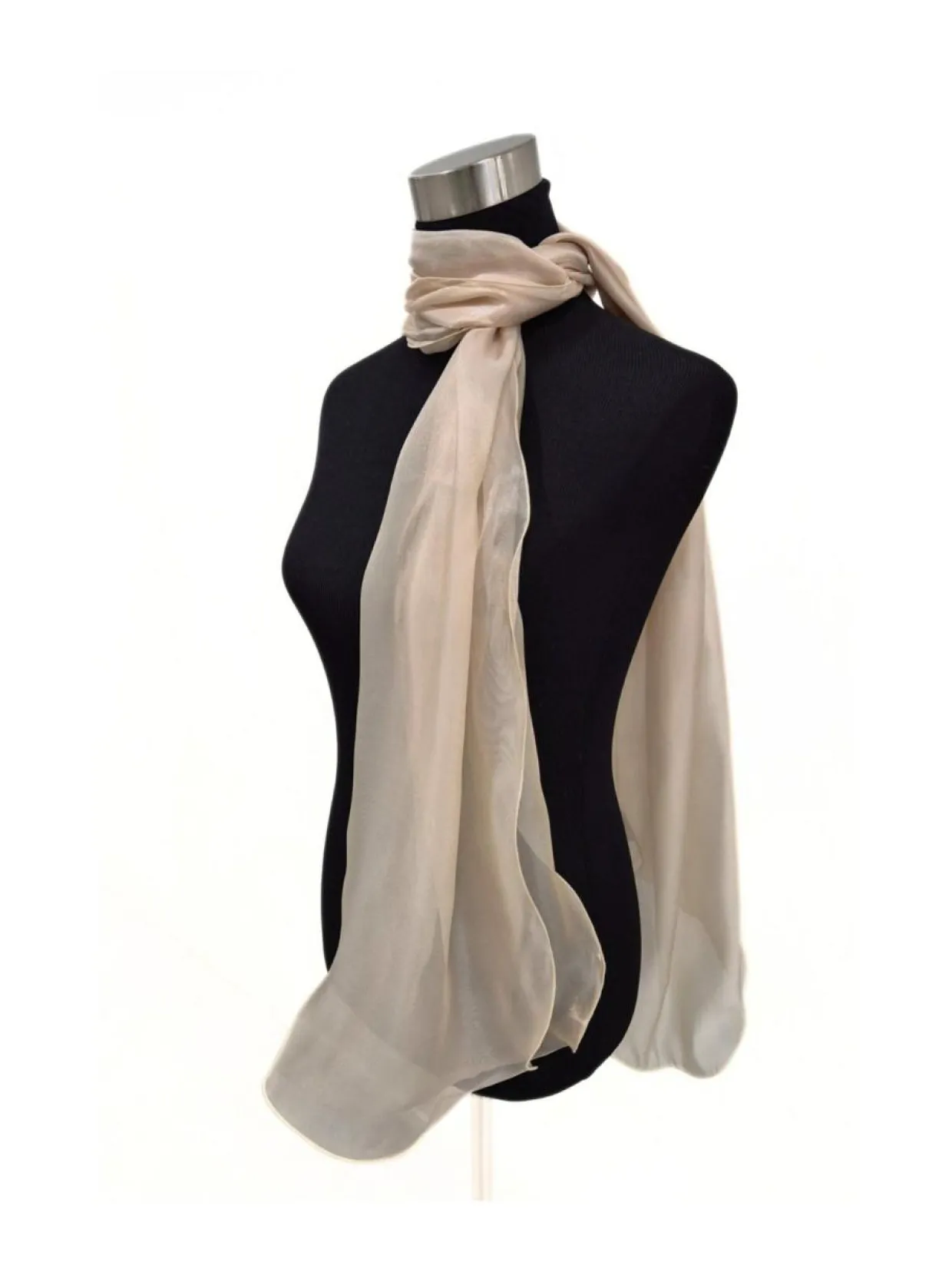 Eleea-juhlahuivi tuo asuusi keveyttä ja tyylikkyyttä aaltoilevilla reunoillaan. Tämä ilmava ja läpikuultava hartiahuivi on valmistettu laadukkaasta 55 % polyesterin ja 45 % polyamidin sekoituksesta juhlavalla kiillolla.