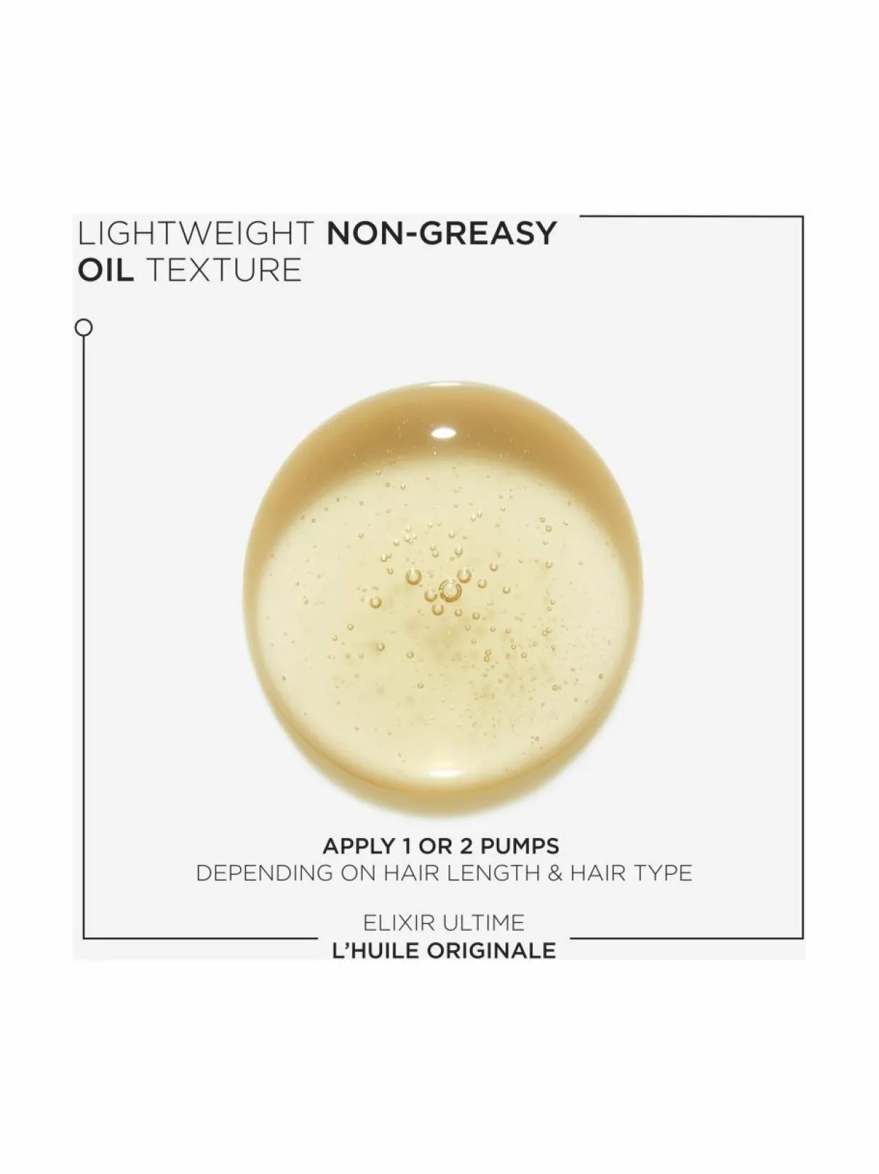 Hiuksiin jätettävä hiusöljy antaa syvää ravitsemusta kiillottomille hiuksille sekä lämpösuojan jopa 230° asti. Se silottaa kaksihaaraisia ja hiusta antaen pitkäkestoista suojaa pörröisyyttä vastaan. Hiukset saavat välittömästi uutta elinvoimaa sekä näkyvää, intensiivistä kiiltoa jopa 48 tunnin ajan. Hiusöljyn poikkeuksellinen tuoksusekoitus sisältää yhdistelmän kukkaistuoksuja orvokista, freesiasta ja mandariinista, sekä puuta ja myskiuutetta.