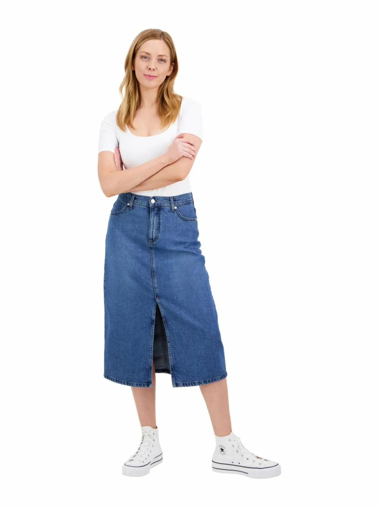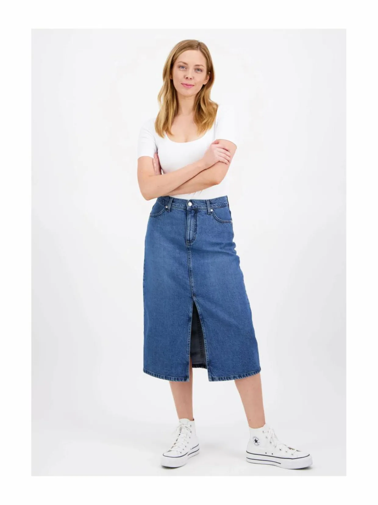 Trendikäs midi-mittainen ja suoralinjainen farkkuhame, jossa on edessä korkea halkio. Hameessa on korkea vyötärö ja normaali istuvuus. Hameen sävy on harmaaseen taittava keskisininen ja siinä on vettä säästävällä lasertekniikalla tehty kulutus. Lyocell-sekoitteinen kangas on pehmeä ja mukava päällä, mutta se ei juurikaan jousta. Huomioithan tämän kokoa valitessasi. Voi käyttää yksin tai yhdistää asukokonaisuudeksi merkin Elsi-takin kanssa. Kaikki Very Nice -farkkuhameet suunnitellaan Suomessa ja valmistetaan MASI Jeansin omalla tehtaalla Virossa.
