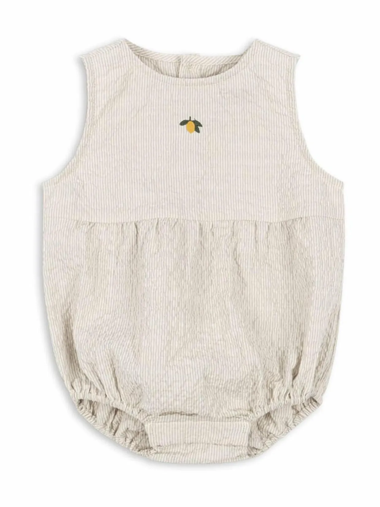 Konges Sløjd -merkin Elliot Romper -body on valmistettu pehmeästä ja hengittävästä luomupuuvillasta. Hihattomassa bodyssa on söpö sitruuna-kuvio edessä ja siinä on pyöreä pääntie. Lahkeensuut ovat joustavat ja se on valmistettu GOTS-sertifioidusta luomupuuvillasta, mikä tarkoittaa, että se on valmistettu vastuullisesti ja ympäristöystävällisesti. Luomupuuvilla on pehmeää ja hellävaraista vauvan iholle.