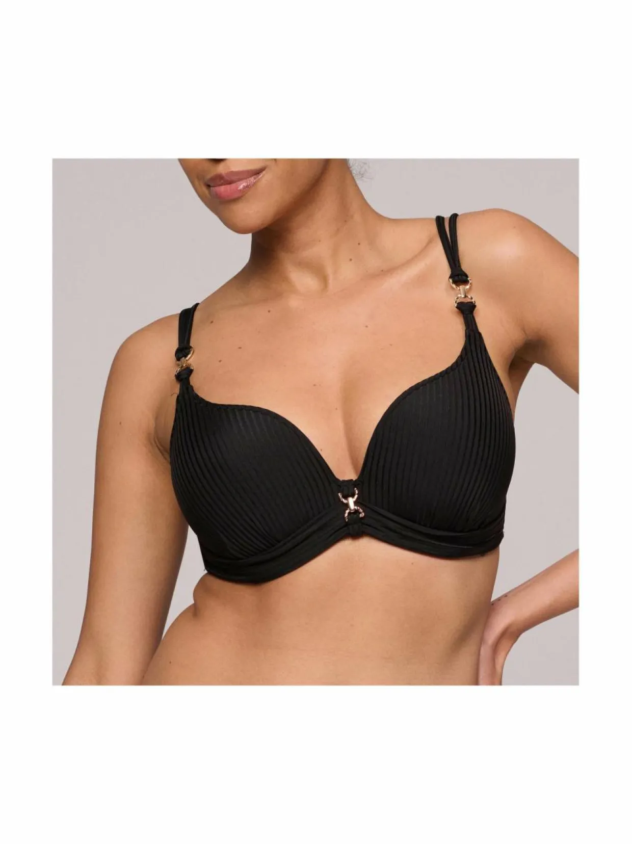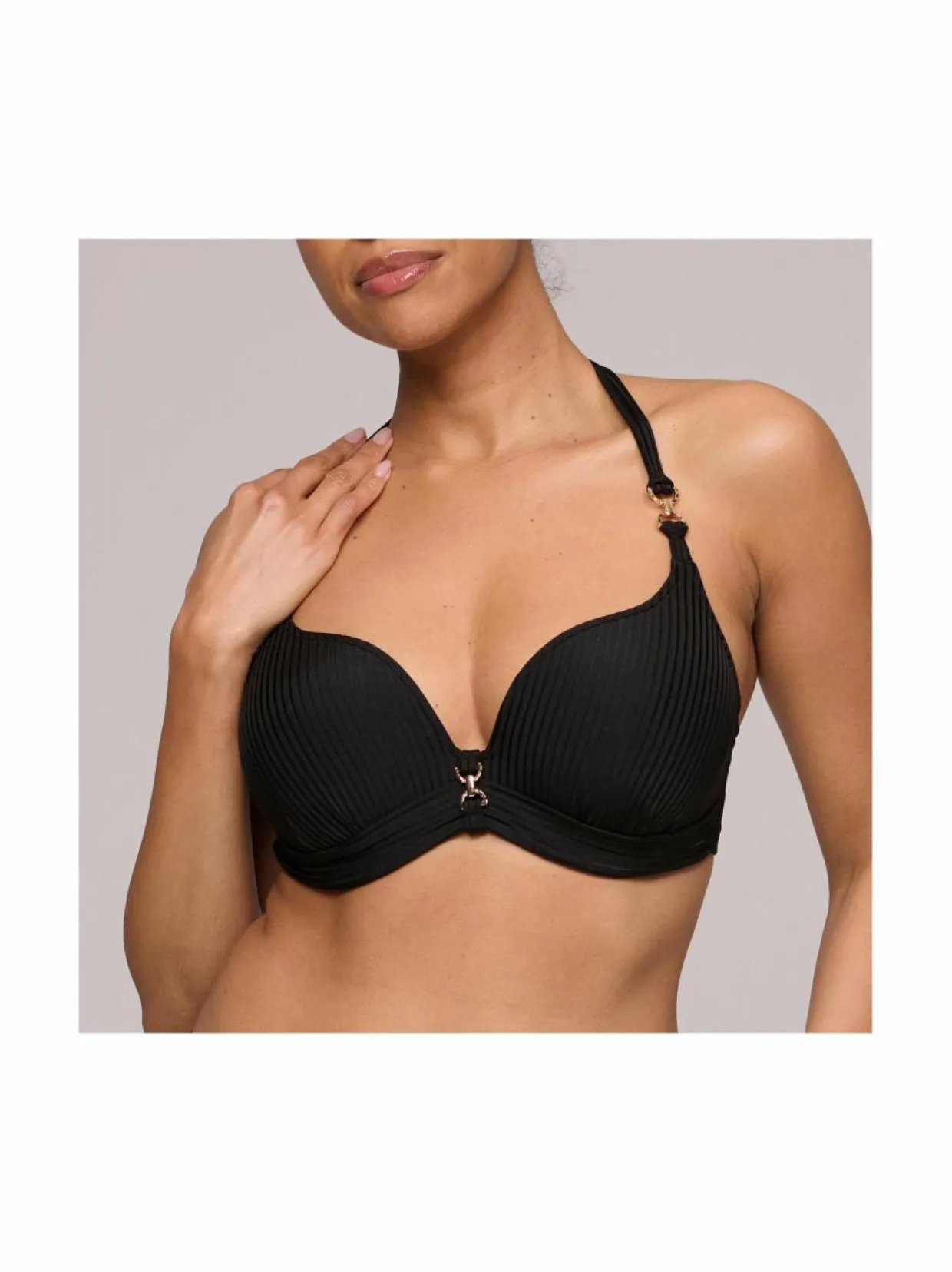 Kaarituelliset bikinirintaliivit Marie Jo merkiltä. Kupeissa on mukava pehmustus, joka antaa rinnoille hyvän tuen. Yksityiskohtana hopeanhohtoiset koristeet olkaimissa sekä kuppien keskellä. Kangas on joustava sekä nopeasti kuivuva. Olkaimia voi käyttää perinteisesti tai laittaa myös kaulan taakse.