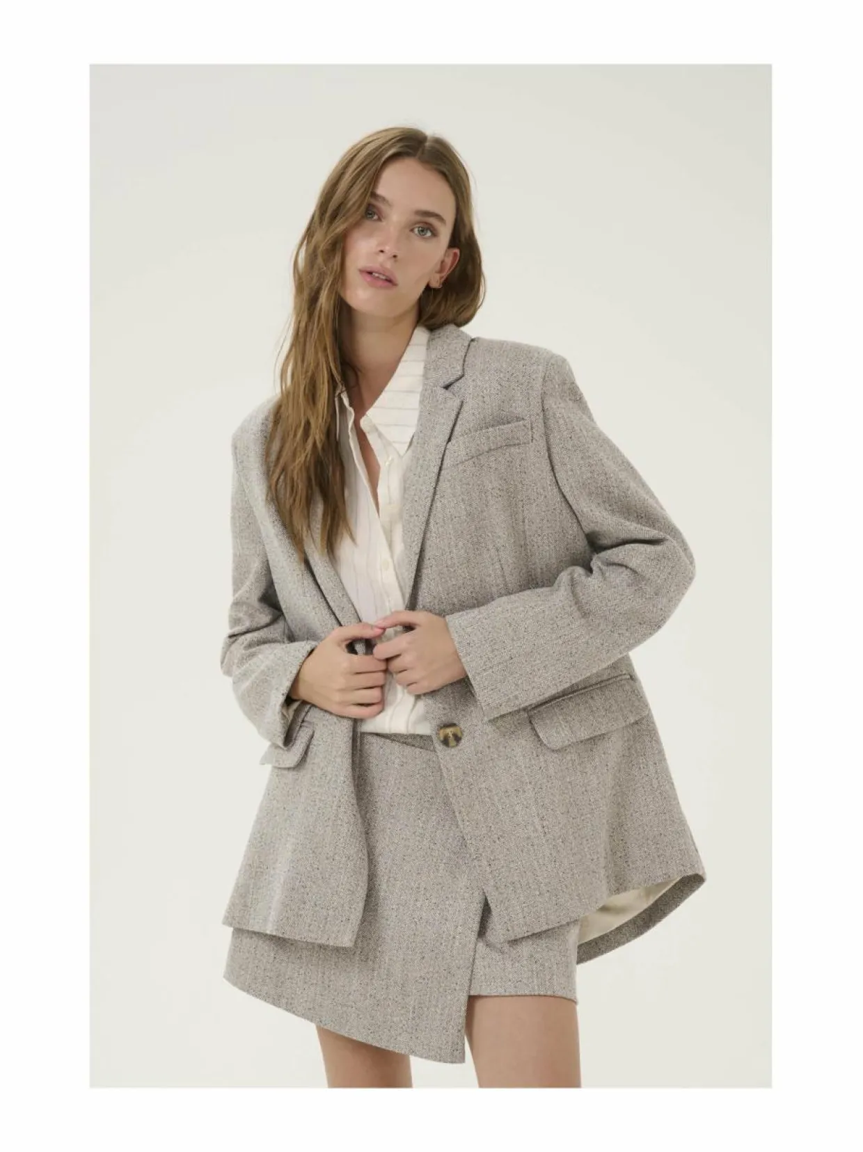 Materiaali78 % polyesteri, 20 % viskoosi, 2 % elastaani Vuorimateriaali95 % polyesteri, 5 % elastaani Hoito-ohjeetKemiallinen pesu ValmistusmaaKiina Väri1304011 OATMEAL MELANGE Avainsanatbleiseri, naisten bleiseri, väljä bleiseri, my essential wardrobe, irtotakki