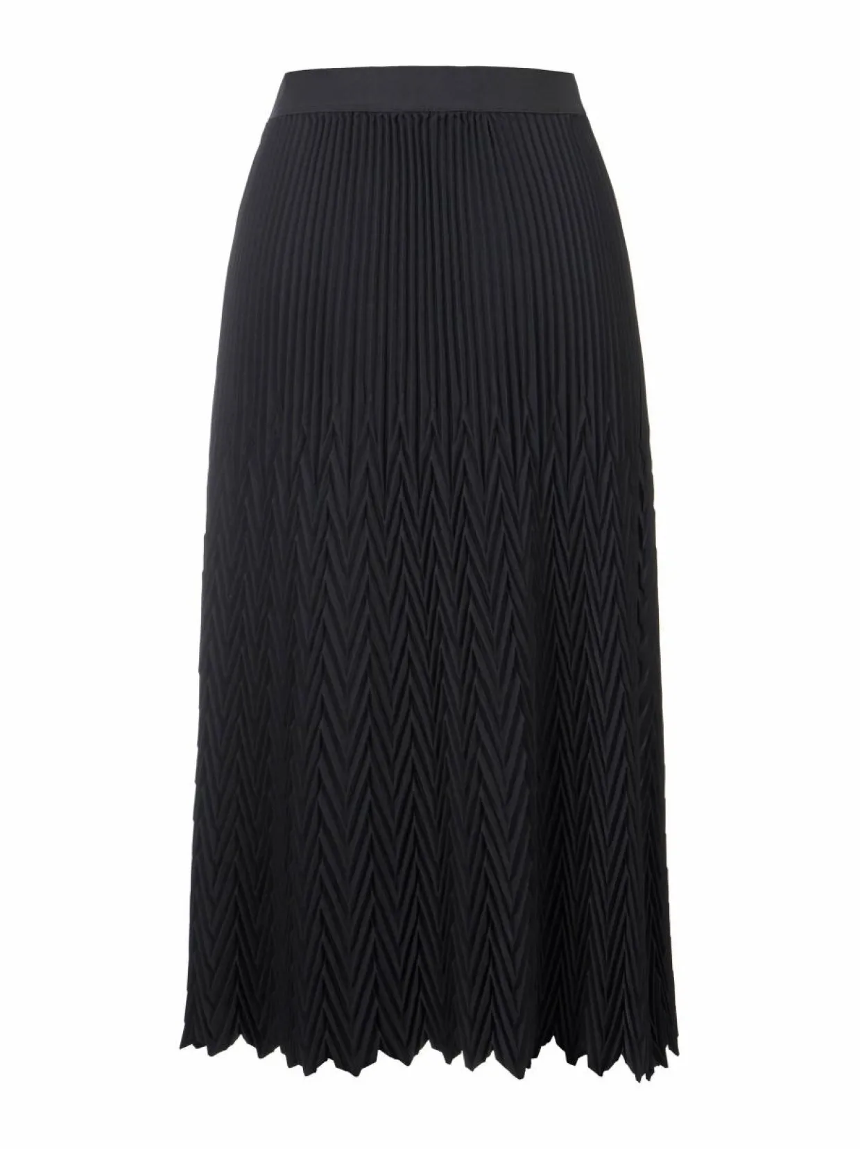 Pohjepituinen, pliseerattu hame, jossa on kaunis kalanruotokuviointi. Hameessa on käytössä mukava, joustava kuminauhavyötärö. Takapituus on 84 cm koossa 36.