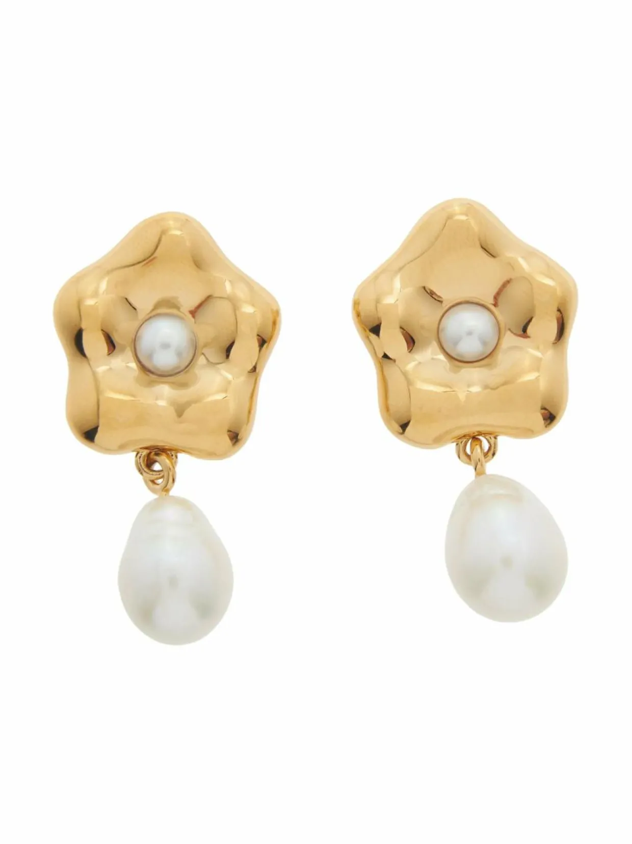 Korvakorut, joissa on herkkä, kukan muotoinen design ja helmikoriste. Korut ovat kiiltävät ja niissä on kauniisti viimeistelty pinta. Materiaalina on käytetty 18k kierrätyskullalla päällystettyä messinkiä, joka tarjoaa kestävyyttä ja arvokkuutta.
