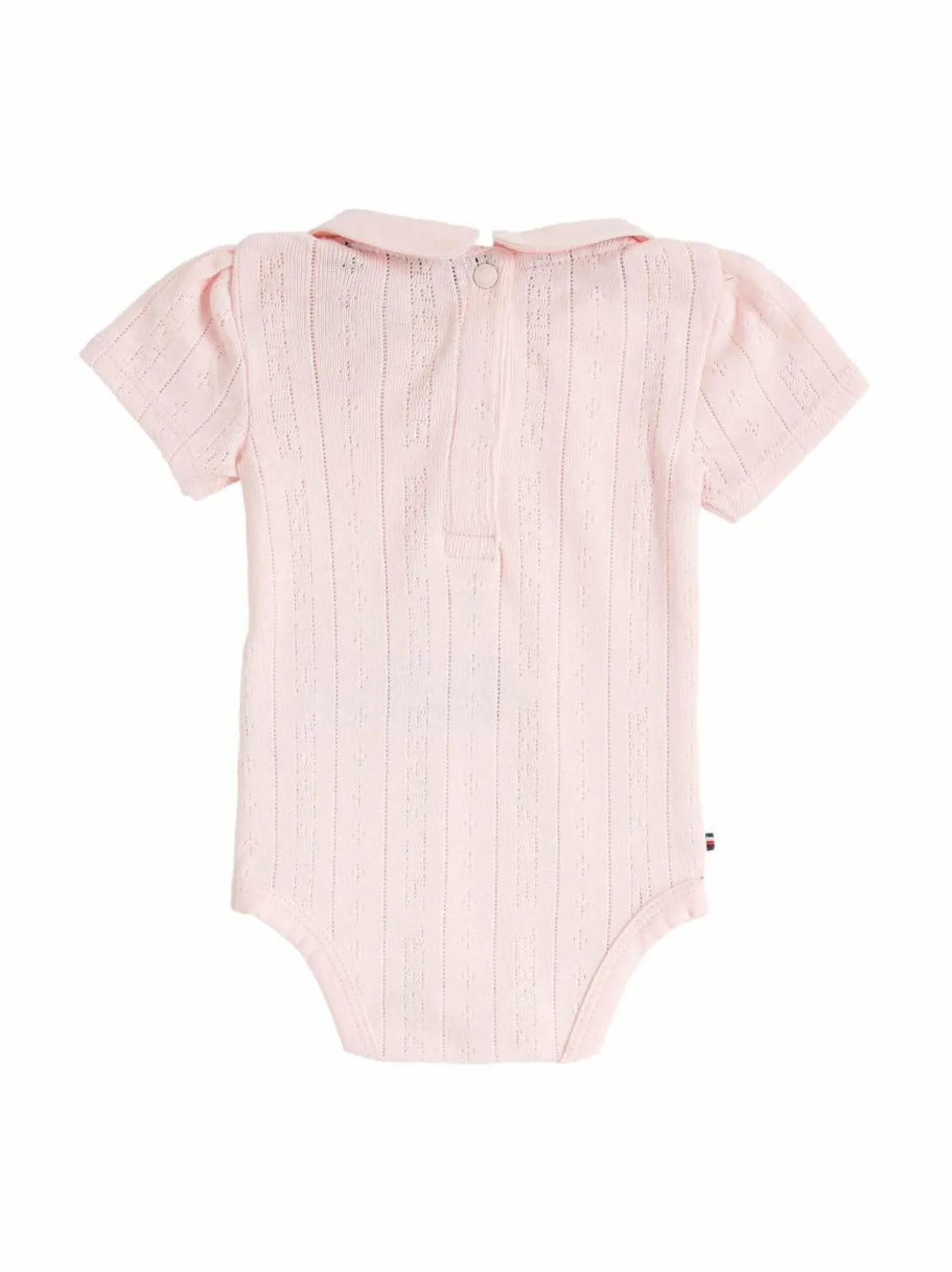 Kauniilla pointelle-neuloksella koristeltu lyhythihainen kaulusbody Tommy Hilfigeriltä. Materiaalina on käytetty pehmeän tuntuista ja ihoystävällistä puuvillaa. Bodyn rinnassa on logolippukirjailu. Haaraosan ja selän nepparit helpottavat sen pukemista ja riisumista.