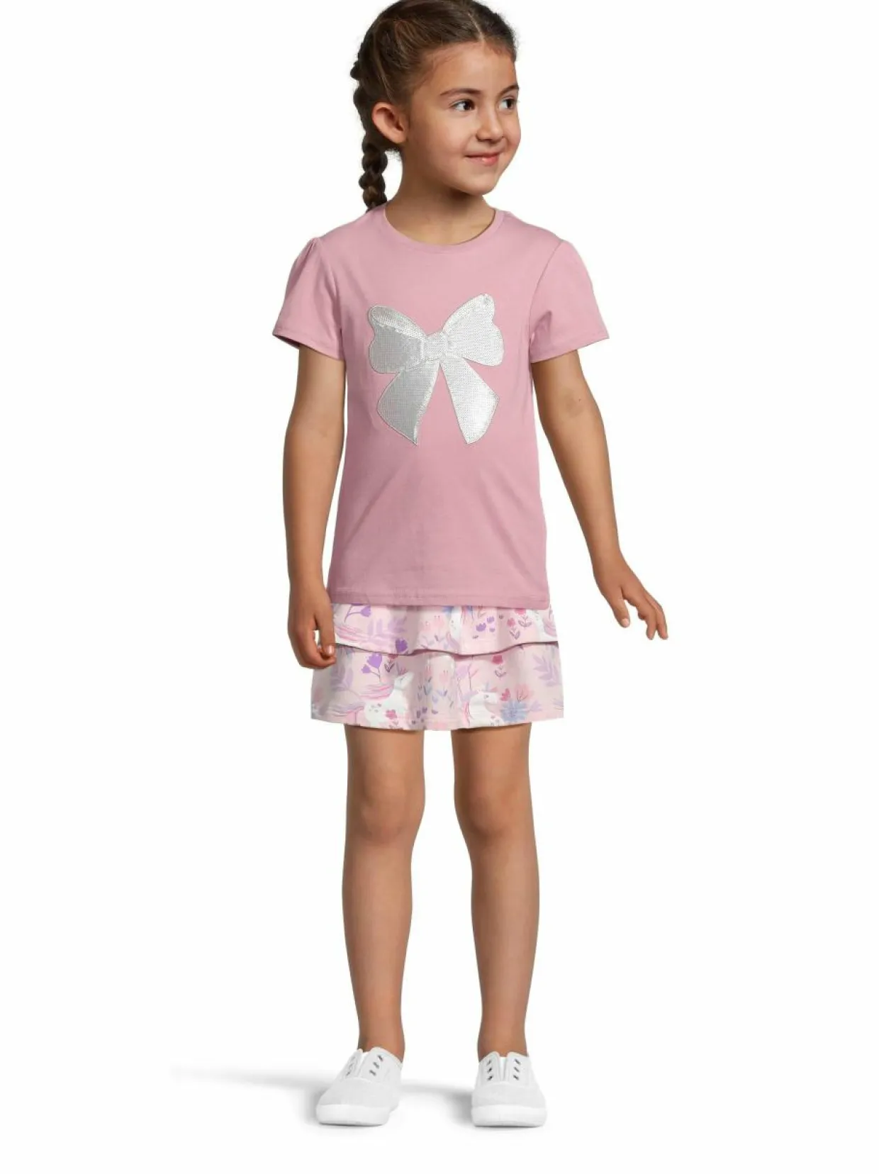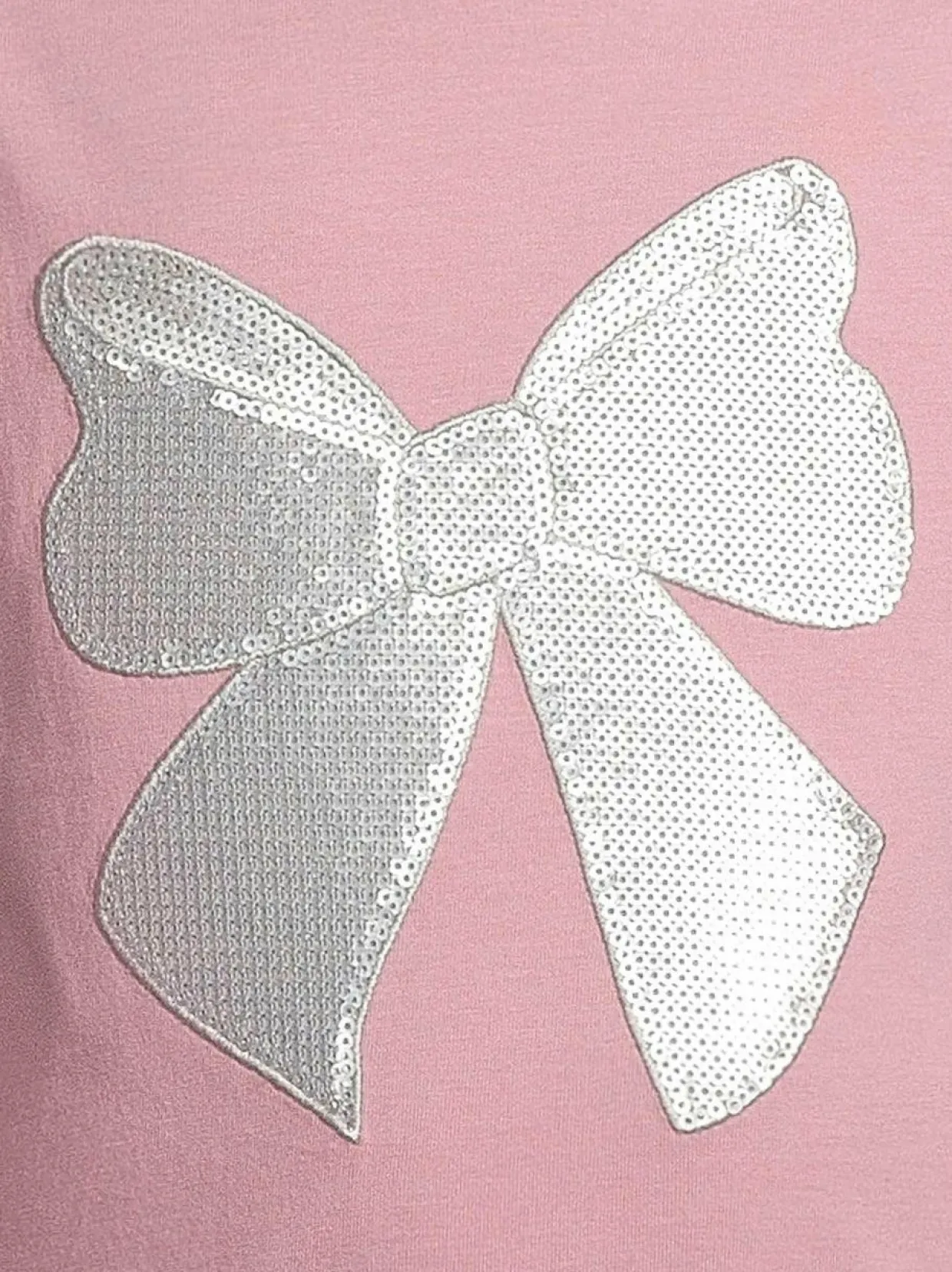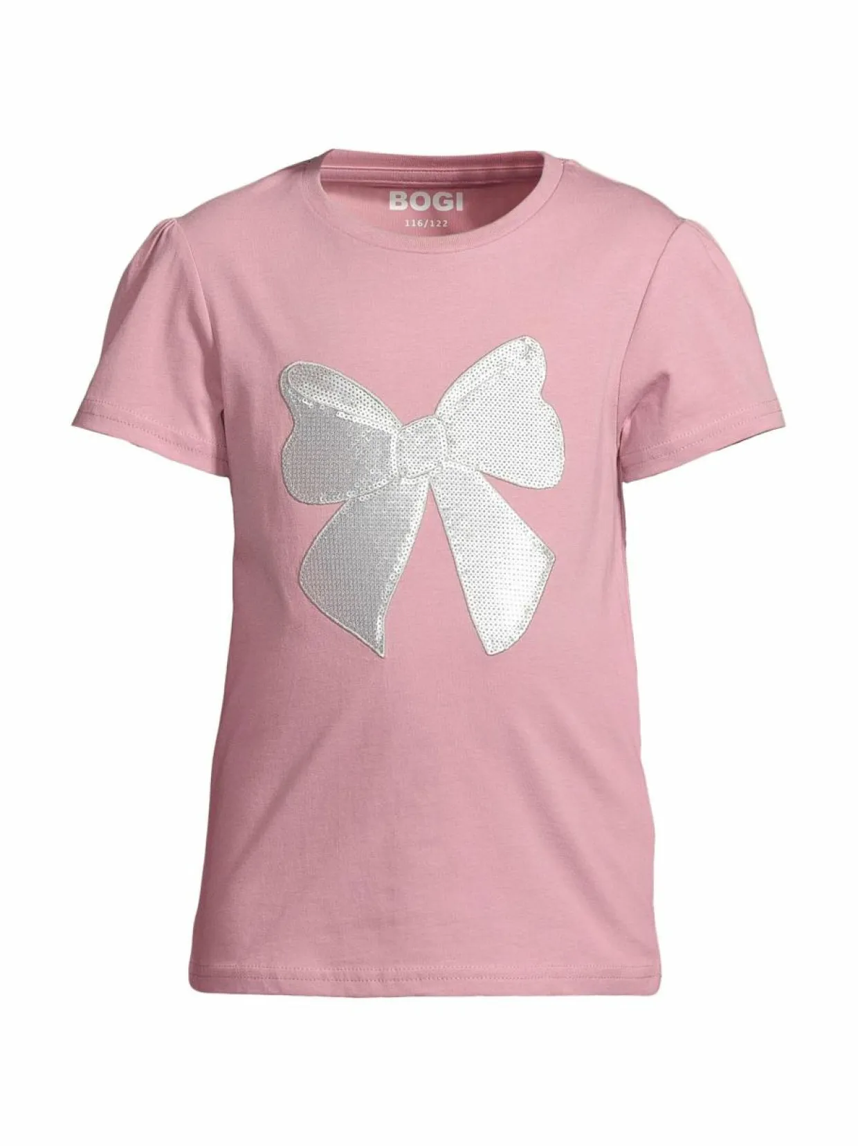 Bogin Evelyn on 100 % luomupuuvillatrikoosta valmistettu t-paita lapsille. Paidan edustaa koristaa suuri, paljeteista muodostettu rusettikuvio, joka tekee paidasta säkenöivän ja mieleenjäävän. Paidassa on pyöreä pääntie ja suora leikkaus.