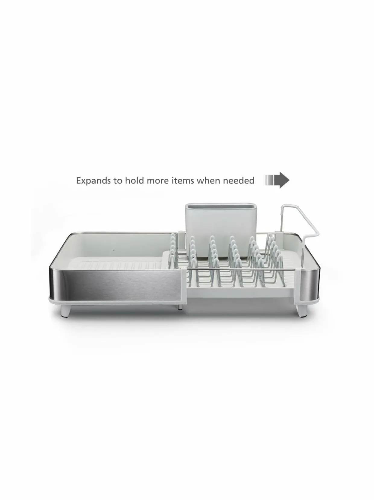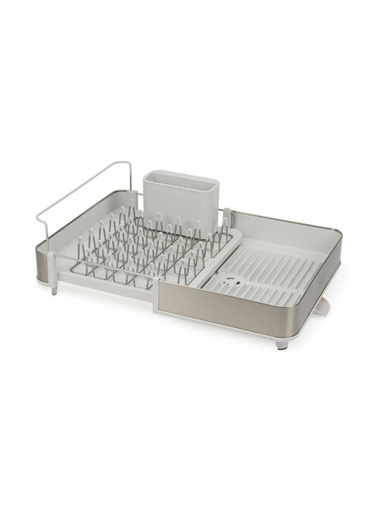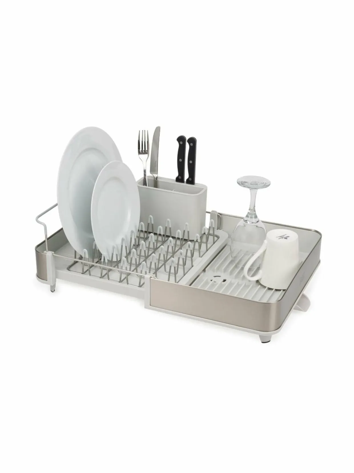 Extend-astiankuivatustelineen kokoa voi säädellä kätevästi tarpeen mukaan. Telineessä on paikat niin lautasille, laseille kuin aterimillekin. Telineessä on 3 eri asentoon säädettävä tyhjennysnokka, jonka kautta vesi valuu pois.