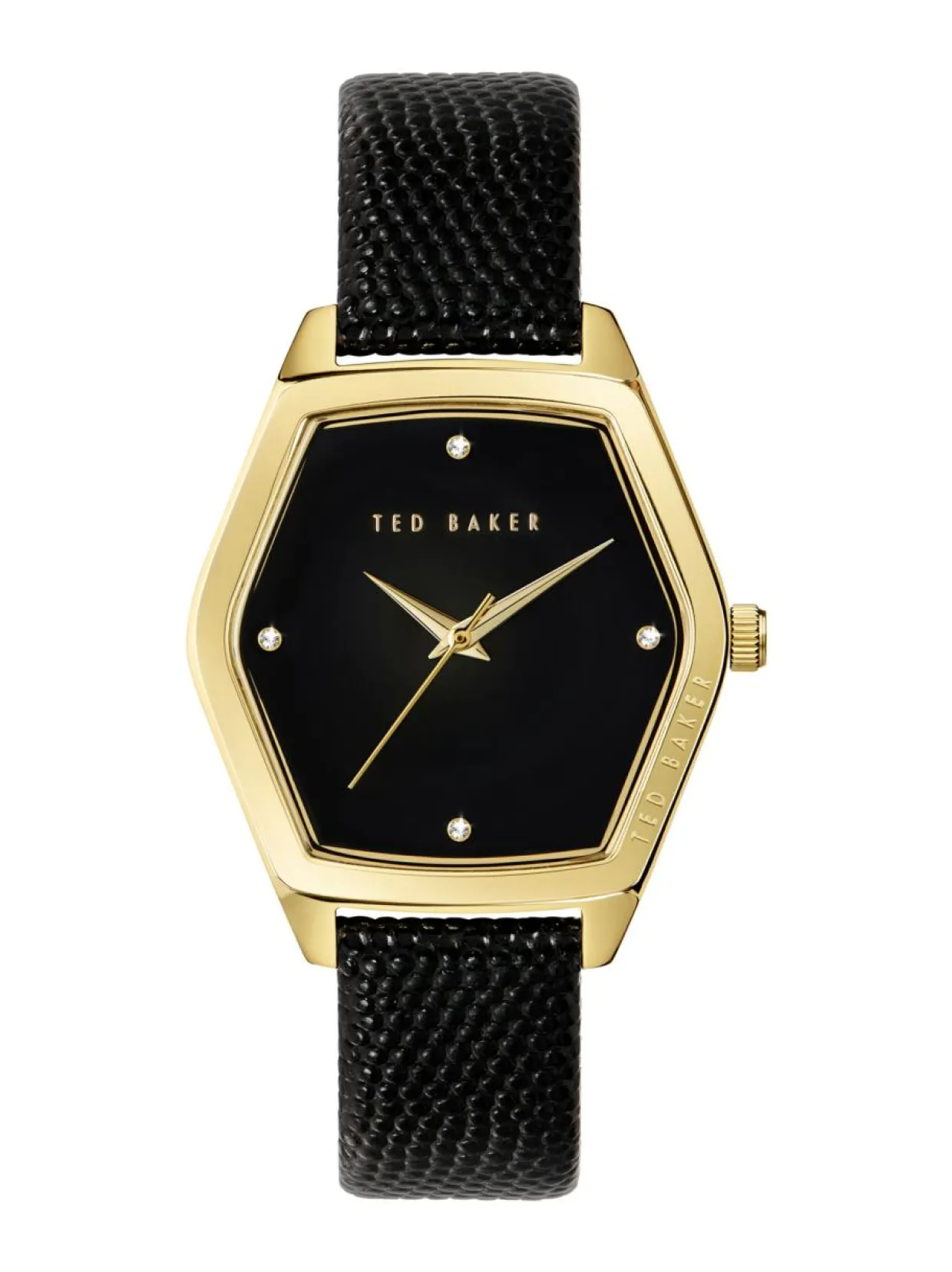 Ted Baker Exter 36mm kuusikulmainen kellon muoto kääntää katseet ja sopii erinomaisesti asuun kuin asuun. Kellon kullanvärinen runko on valmistettu ruostumattomasta teräksestä. Sen leveys on 36mm ja paksuus on 8mm. Tässä kellossa on musta liskokuvioinen nahkaranneke. Kellon mustassa taulussa säihkyvät Swarovskin kristallit jokaisen neljännestunnin kohdalla. Kellossa on mineraalilasi ja kvartsikoneisto. Kellon vesitiiviys on 5ATM. Ted Baker kelloilla on 2 vuoden takuu.