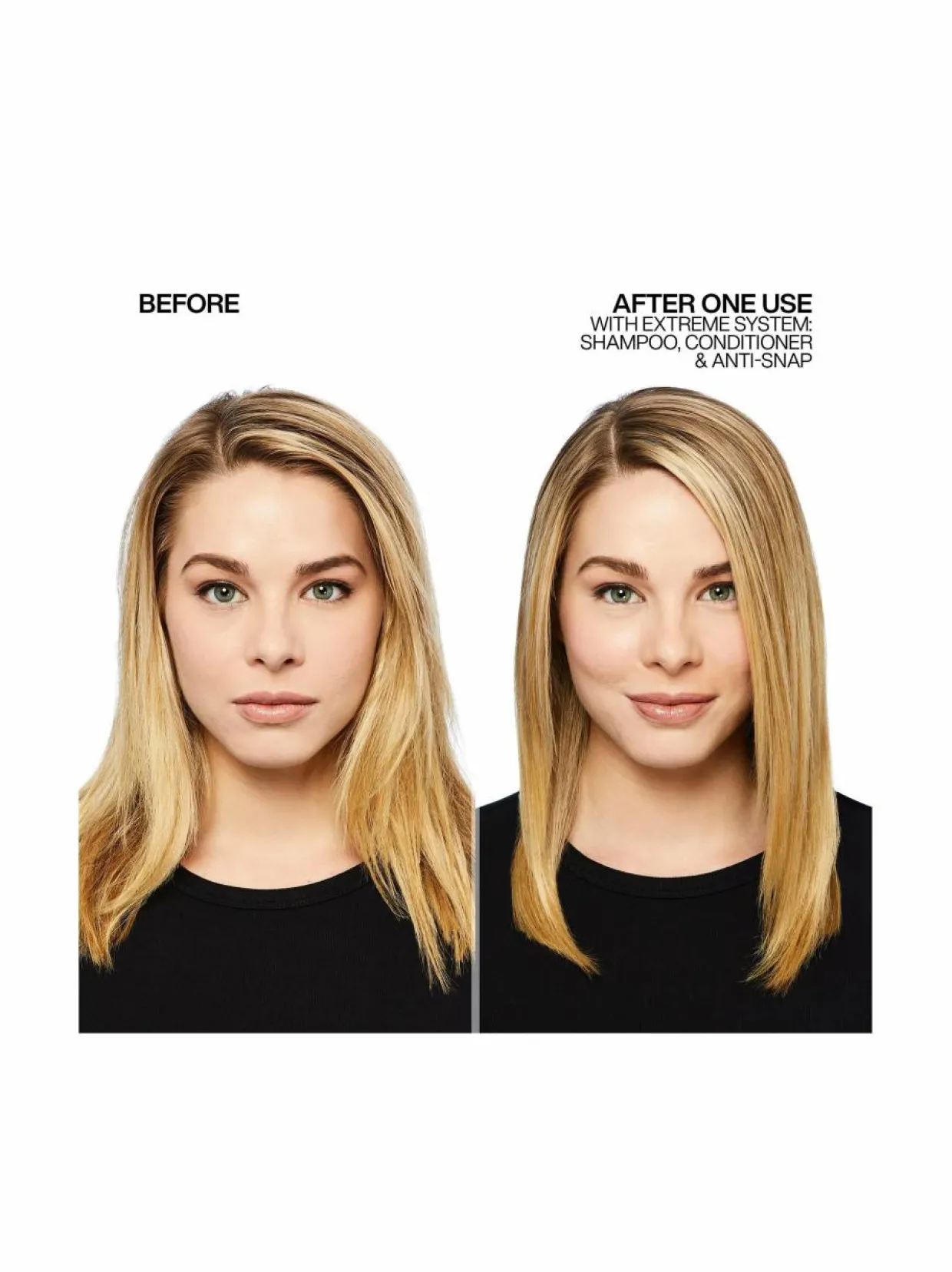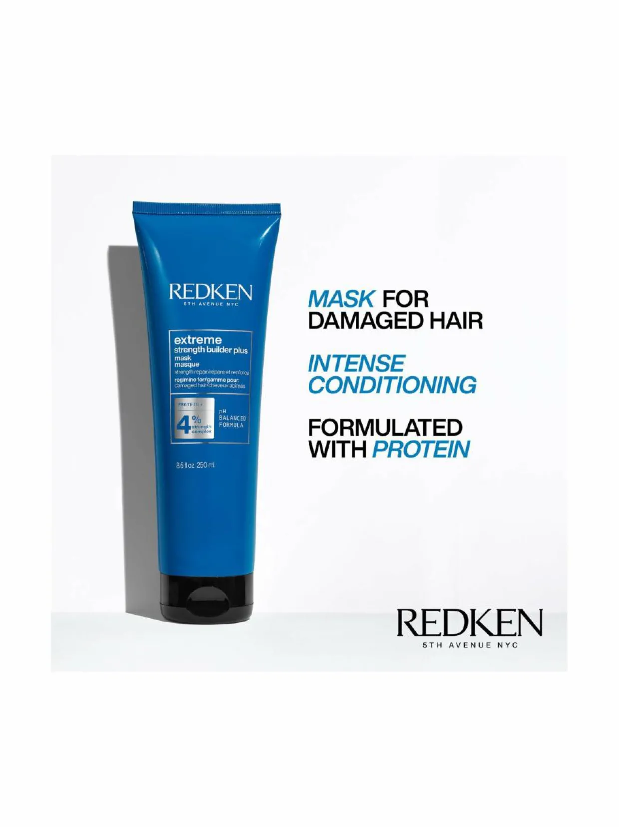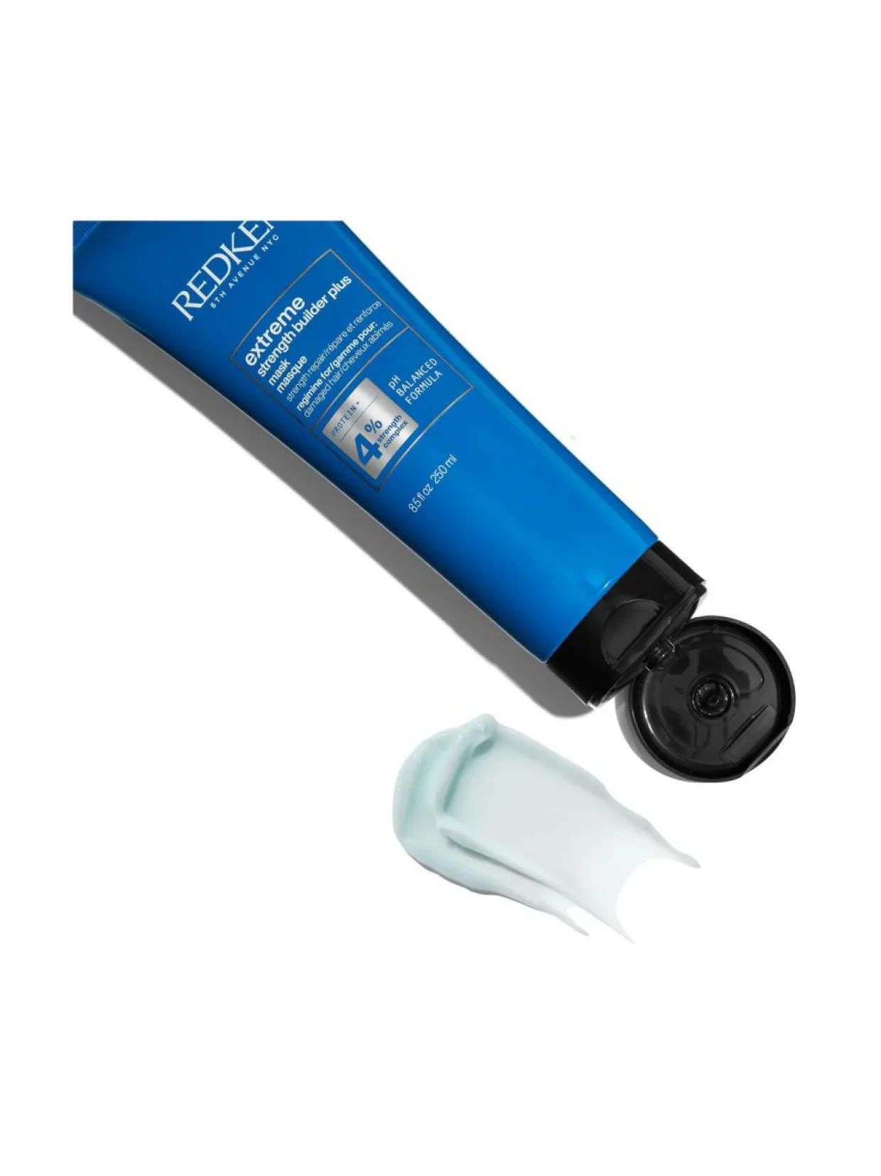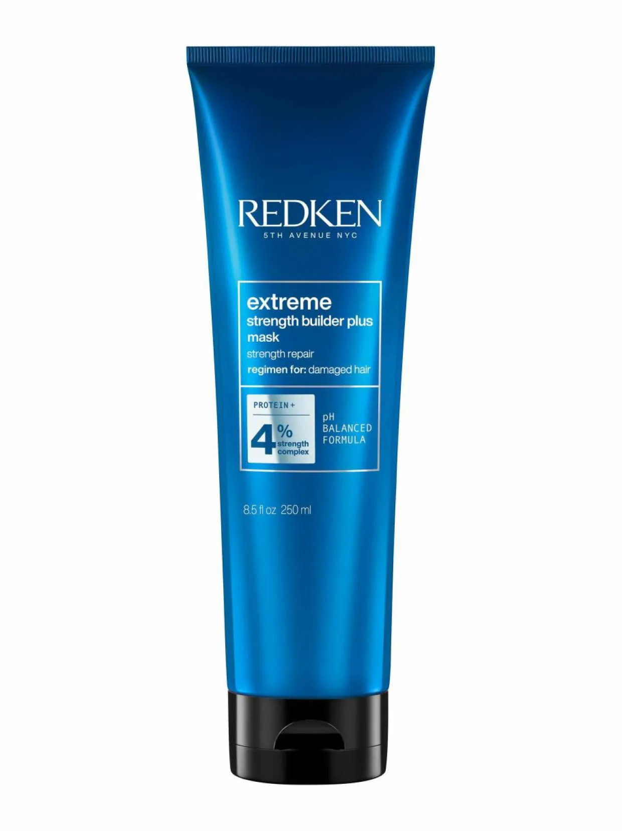 Extreme Strength Builder Plus -hiusnaamio korjaa ja vahvistaa vaurioituneita hiuksia. Se tekee hiuksista terveen näköiset ja vastustuskykyisemmät. Hiukset saavat välittömästi kiiltoa ja ovat helpommin käsiteltävät. Tämä hiusnaamion koostumus sisältää Redkenin Strength Complex -ainesosayhdistelmän, joka sisältää aminohappoja (arginiinia), joka auttaa vahvistamaan ja palauttamaan hiusten vahvuutta, sekä sitruunahappoa tasapainottamaan hiusten pH-arvoa.Levitä hiusnaamio pyyhekuiviin hiuksiin Extreme-shampoolla pesun jälkeen. Anna sen vaikuttaa vähintään 5 minuuttia ja huuhtele huolellisesti. Käytä hiuksiin sen jälkeen Anti-Snap -hoitotuotetta.Redken keskittyy kestävään kehitykseen. Redkenin hiustenhoitotuotteiden pullot ovat kierrätettäviä ja niissä on käytetty jopa 93 % kierrätettyä muovia.