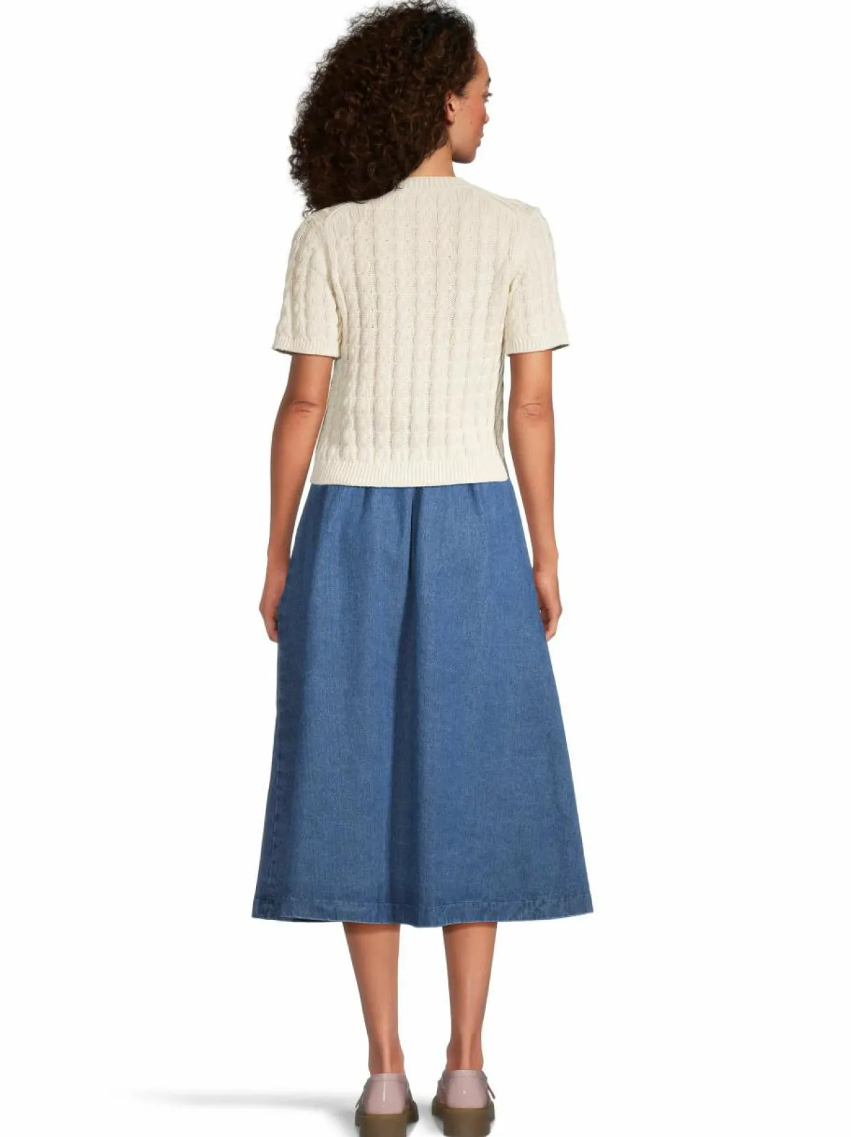 Rue de Tokion A-linjainen farkkuhame on valmistettu pehmeästä ja mukavasta luomupuuvillasta. Hameessa on kaksi sivutaskua ja joustava resori vyötäröllä. Täydellinen valinta kesäiseen rentoon arkipukeutumiseen.