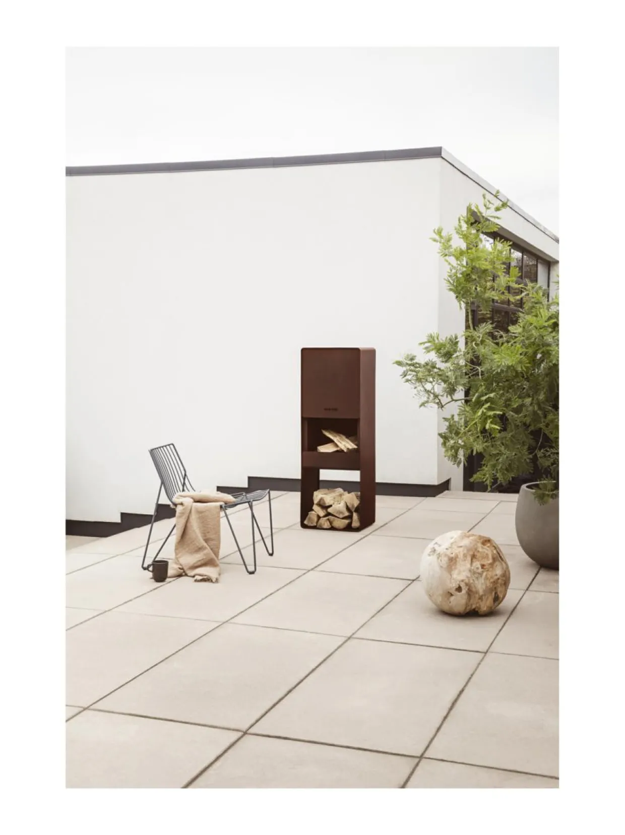 Eva Solon FireBox-ulkotakka tekee pitkistä, valoisista kesäilloista entistäkin tunnelmallisempia. Alaosan kätevään polttopuutelineeseen mahtuu reilusti halkoja, ja sisäänrakennettu savupiippu ohjaa savun poistumaan ulkotakan taustapuolelta. FireBox toimitetaan valmiiksi koottuna.