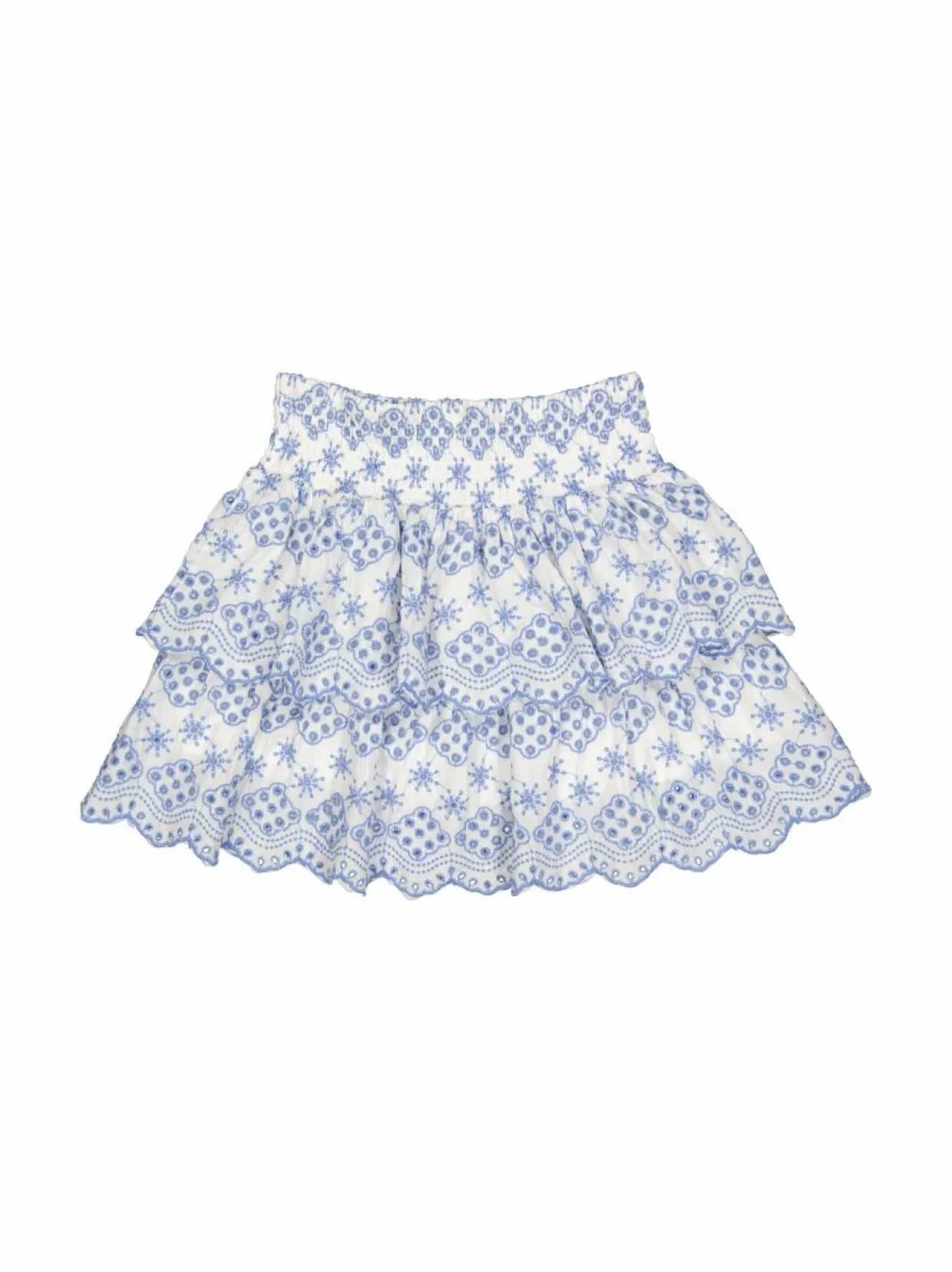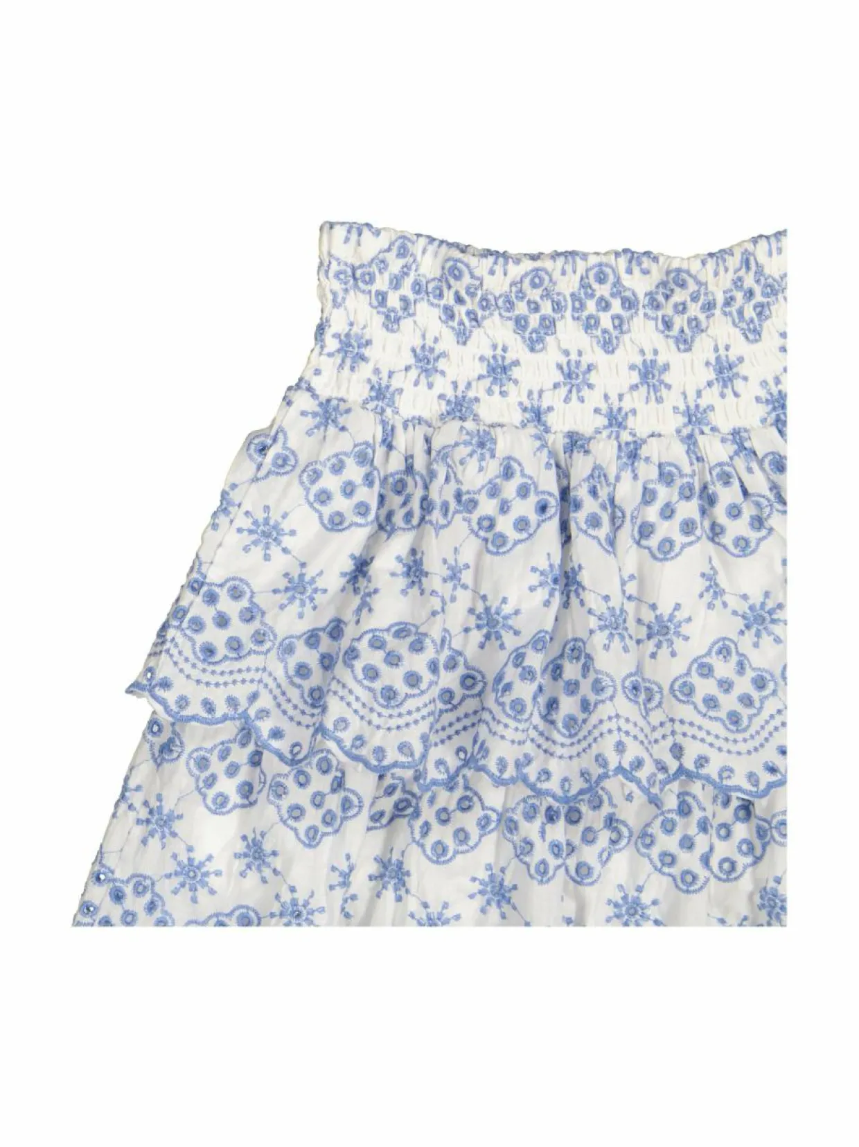 Kaunis röyhelöhame, jossa broderie anglaise -yksityiskohtia ja rypytetty vyötärö. Lindexin hame on vuorattu ja valmistettu miellyttävän tuntuisesta puuvillasta.