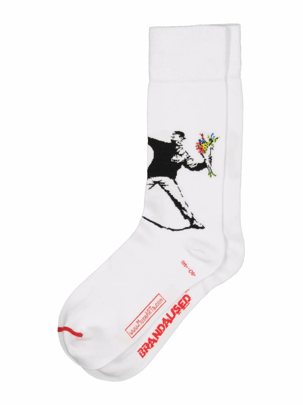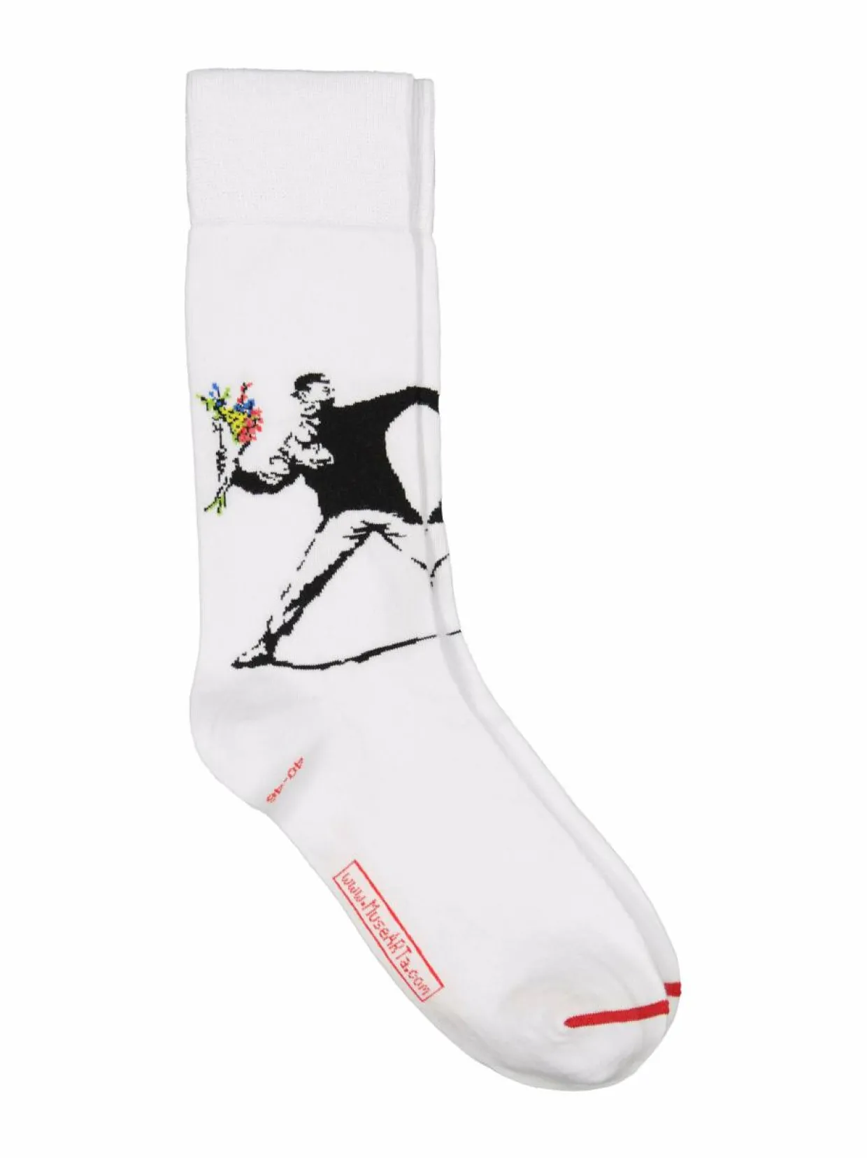 Tunnettuun, alun perin Jerusalemissa nähtyyn katutaideteokseen perustuvat sukat. Taideteos kuvastaa maskiin sonnustautunutta kukkia heittävää palestiinalaista. One size koko 40-46.