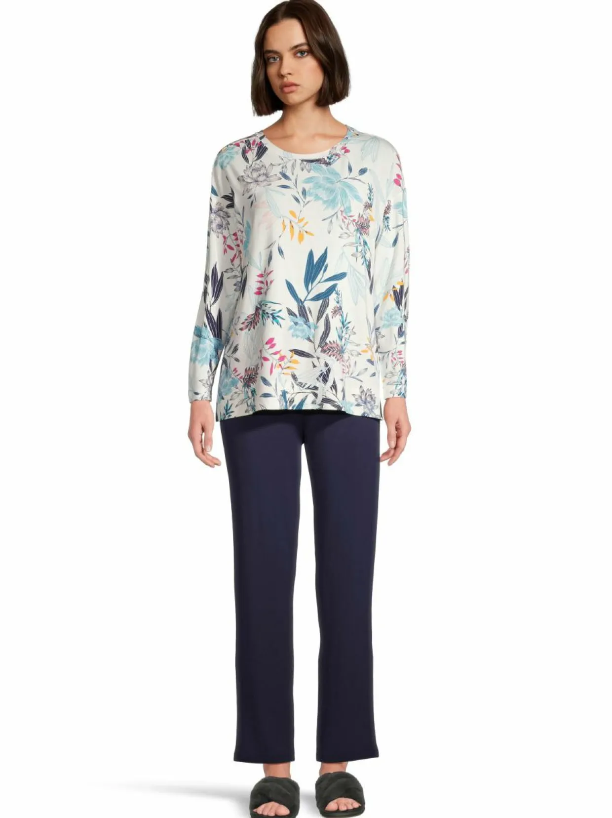 Nauti ylellisestä mukavuudesta ja kauniista ulkonäöstä tässä pyjamassa. Yläosassa on lehtikuvioitu printti ja pitkät hihat, jotka luovat rennon ilmeen. Alaosa on yksivärinen ja siinä on joustava vyötärö, joka takaa täydellisen istuvuuden. Trikoomateriaali on erittäin pehmeä ja miellyttävä iholla, tarjoten samalla joustavuutta ja kestävyyttä. Tämä pyjamasetti sopii täydellisesti rentouttaviin hetkiin kotona.