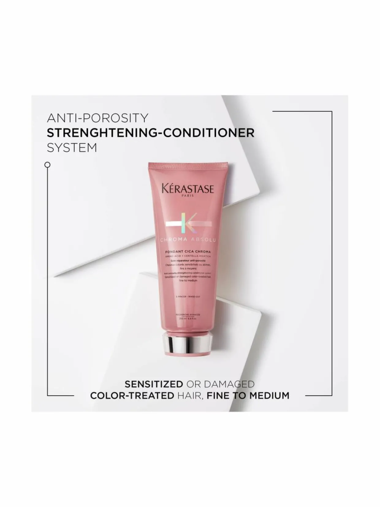 Kérastase Fondant Cica Chroma on tehokas huokoisuutta estävä korjaava hoitoaine herkistyineille tai vaurioittuneille värikäsitellyille hennoille tai keskipaksuille hiuksille.Kevyt koostumus, joka pääsee hiuksen sisimpään täyttämään huokoisuutta, kosteuttamaan ja vahvistamaan sisältäpäin ja säilyttämään eloisan värin. Koostumus pääsee hiuksen sisimpään ja tekee hiussuortuvista vahvemmat.Hiukset ovat kosteutetummat ja vähemmän huokoiset, mikä auttaa väriä säilymään pidempään.