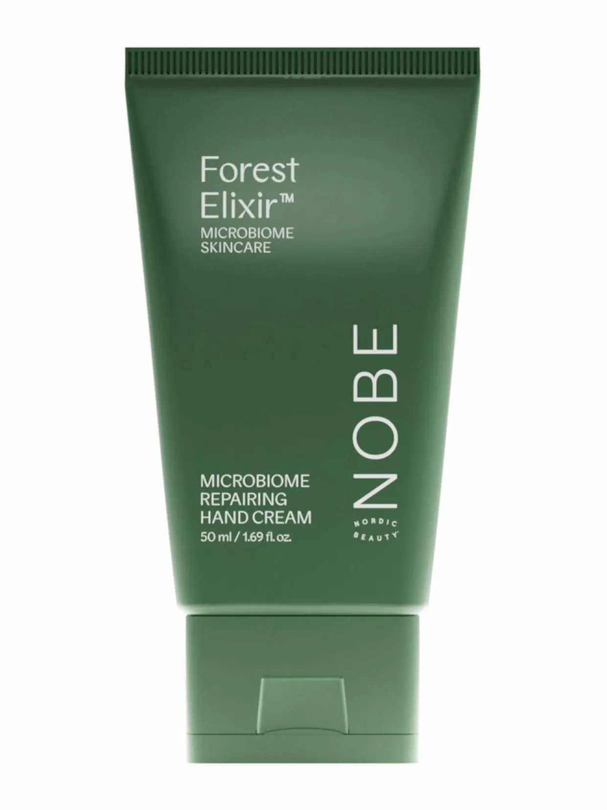 NOBE Forest Elixir® Microbiome Repairing Hand Cream 50 ml on ihon mikrobiomin hyvinvointia tukeva, kosteuttava käsivoide, joka sisältää innovatiivista Re-Connecting Nature® -metsämikrobiuutetta. Suomalaisen Uute Scientificin kehittämä ja patentoima metsämikrobiuute on maailman ensimmäinen metsän monimuotoista ja rikasta biodiversiteettiä vastaava luonnollinen uute. Uusiutuvista lähteistä valmistetun raaka-aineen on tieteellisesti todistettu palauttavan ihon mikrobiomin luonnollisen tasapainon, vahvistavan ihon suojakerrosta ja tehostavan ihon uusiutumista.