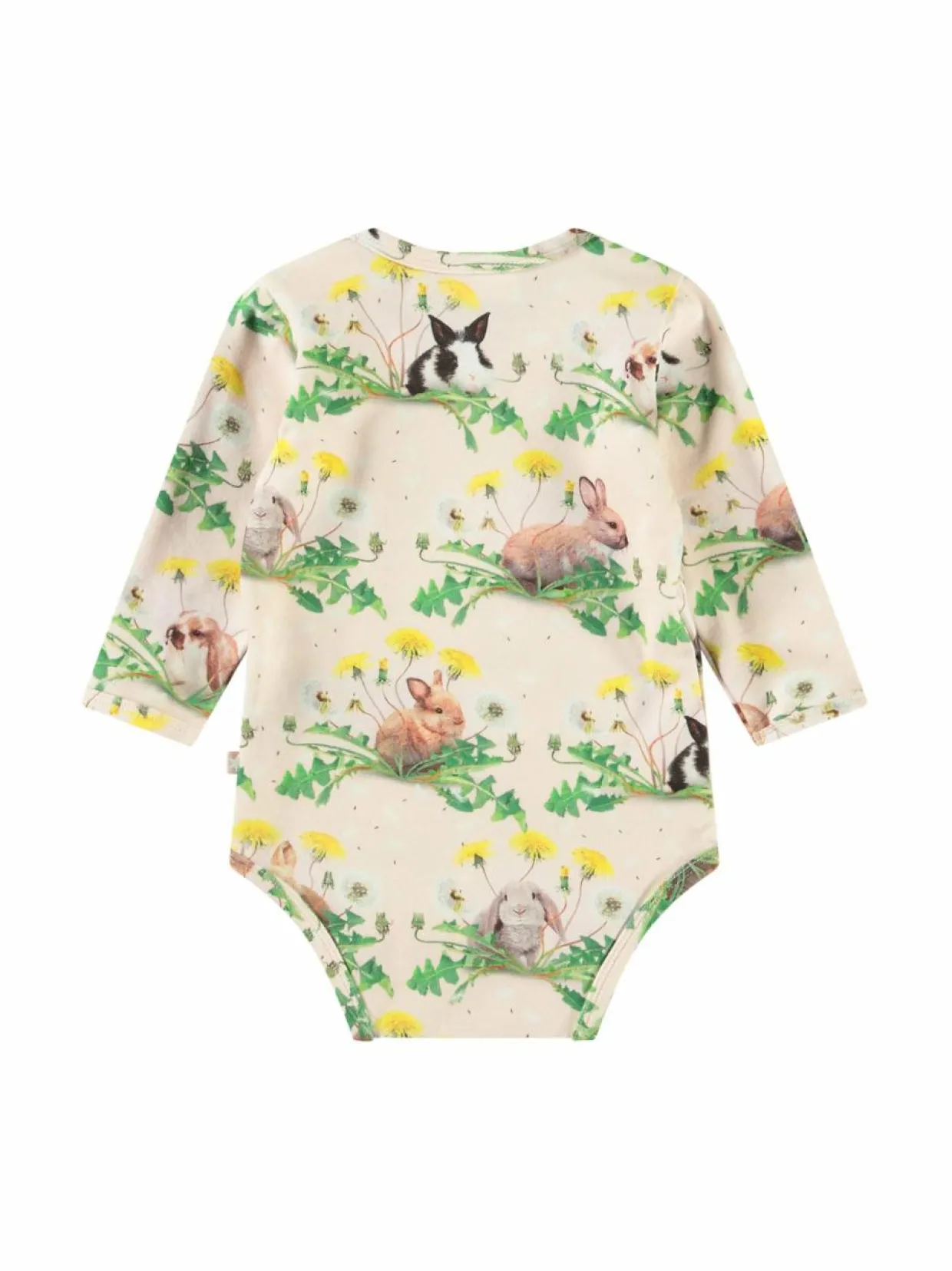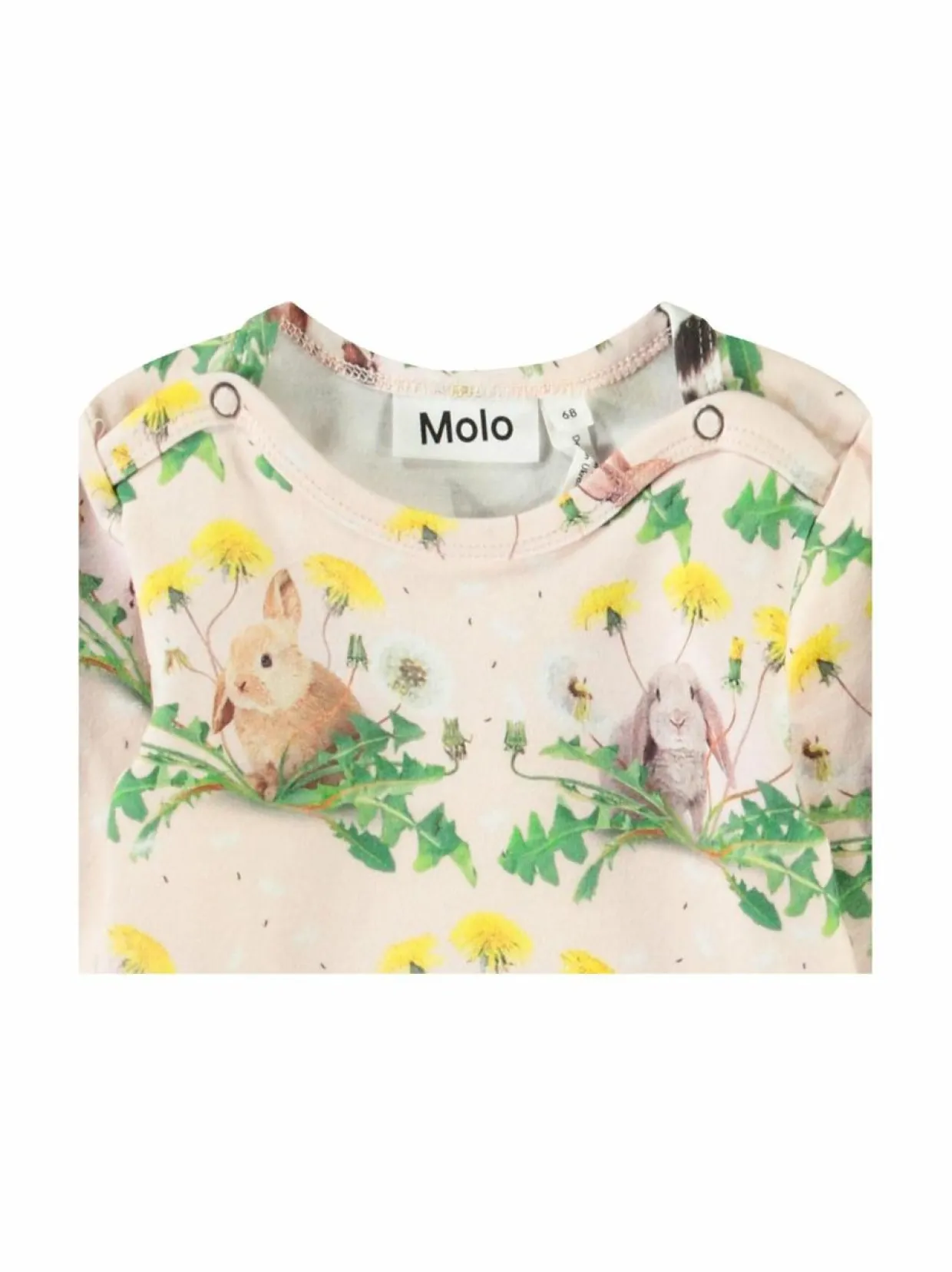 Ihastuttava Foss Bunnies -body brändiltä Molo on valmistettu pehmeästä ja joustavasta trikoosta, joka sisältää 95 % luomupuuvillaa. Bodyssa on söpöjä pupujen ja voikukkien kuvioita. Body on pitkähihainen ja siinä on nepparit olkapäillä ja haaroissa. Se on helppohoitoinen ja se voidaan pestä koneessa.