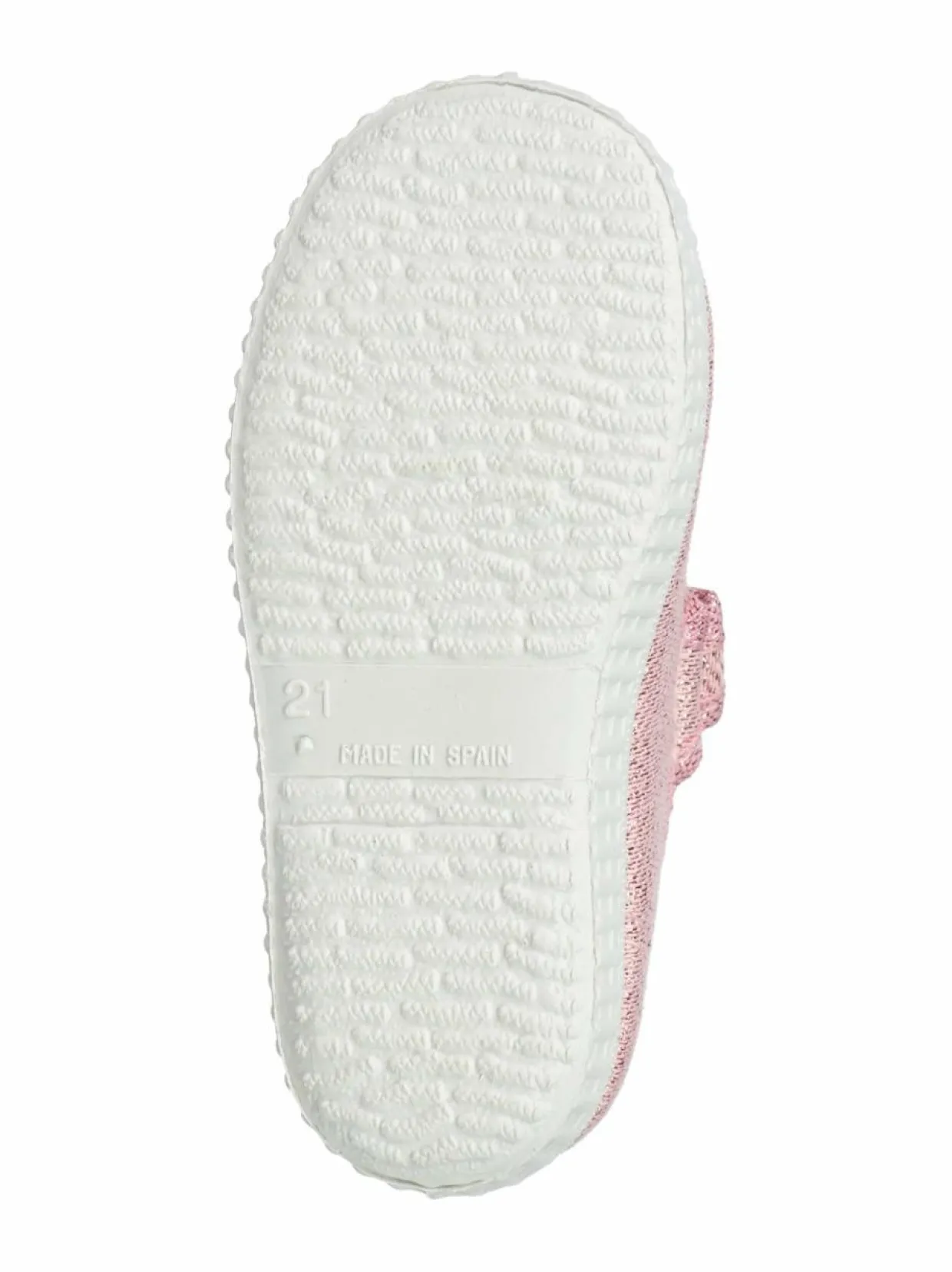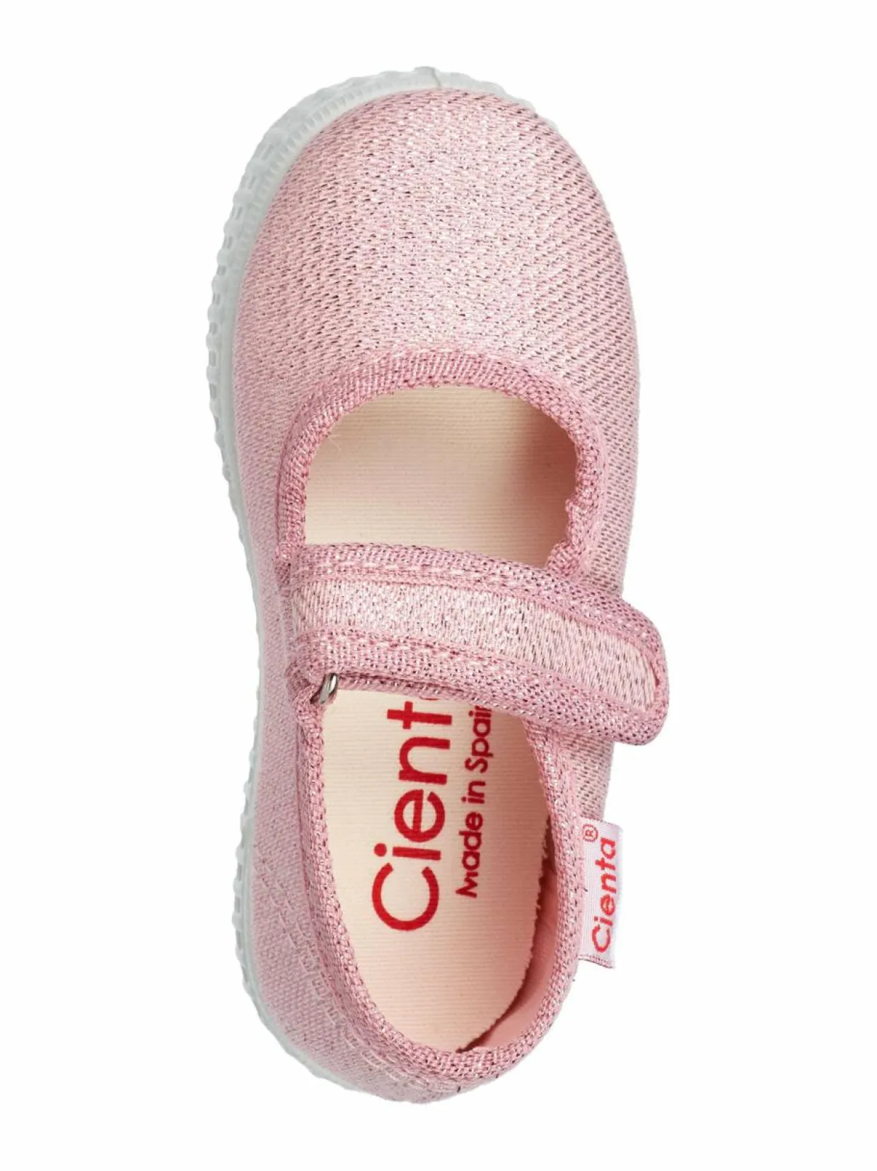 Kesäisissä Cienta-kangaskengissä on pitävä kumipohja. Kimaltava glitter-väri tuo arkeenkin juhlan tuntua. Kengät ovat mukavat jalassa ja helppo pukea, sillä kengissä on kätevä tarrakiinnitys. Pohjamateriaalissa on kevyt kukkaistuoksu.