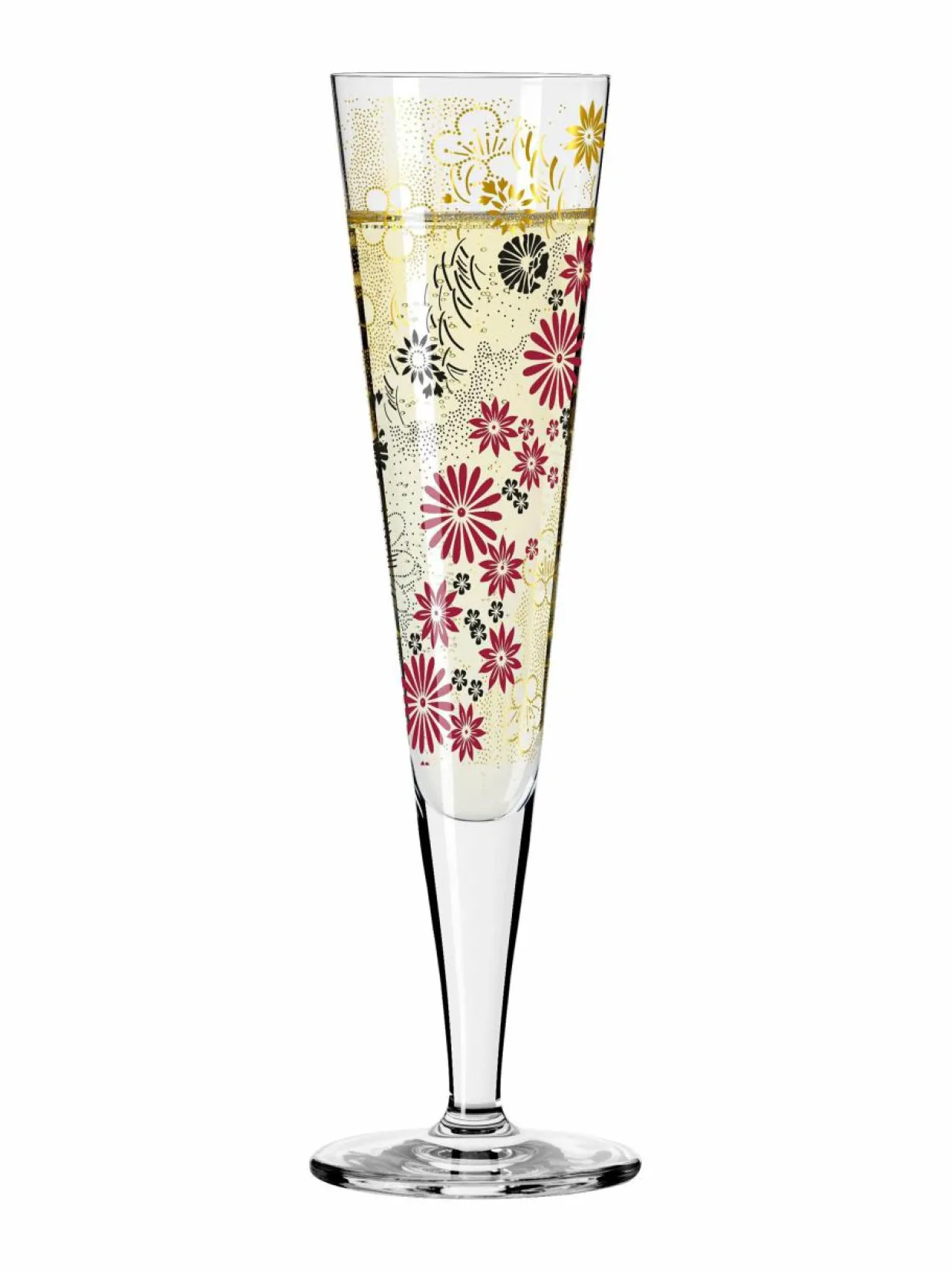 Ajaton ja tyylikäs samppanjalasi, jonka viimeistelyssä on aitoa kultaa. Lasit on viimeistelty tyylikkäillä kuviointiaiheilla.