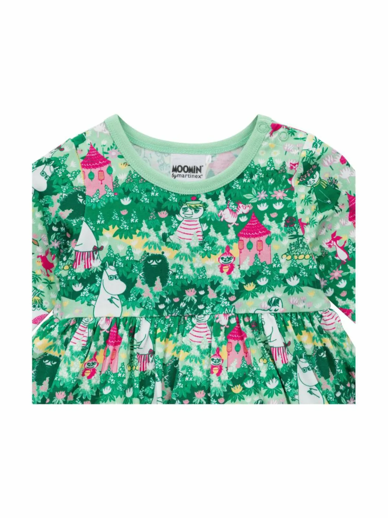 Greenery on ihastuttava Muumi-bodymekko vauvoille. Mekossa on pitkät hihat, leveä helma sekä napit olkapäillä ja haarassa. Bodymekko on valmistettu luomupuuvillasekoitteesta. Mekko on pehmeä ja mukava päällä. Se on täydellinen valinta vauvalle, joka rakastaa Muumeja.
