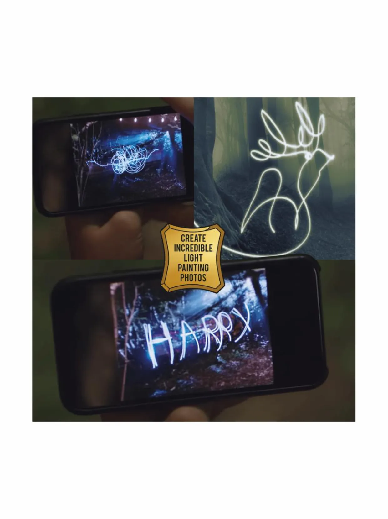 Erittäin laadukas jäljennös Harry Potterin taikasauvasta, jonka kärjessä on kirkas LED-valo, jonka voit sytyttää painamalla kahvaan piilotettua painiketta. Ainoa ero alkuperäiseen taikasauvaan on, että jäljennös on alkuperäistä hieman pienempi. Kun sytytät taikasauvan Lumos-kärjen, todellinen taikuus alkaa! Lataa ilmainen Wow! Stuff -sovellus, niin voit kuvata itseäsi ja muita velhoja ja noitia, kun käytätte taikasauvaa hämärässä. Sovelluksen avulla saat uskomattoman erikoisia kuvia! Kirjoita nimesi ilmaan taikasauvalla, piirrä omia loitsujasi ilmaan, käy hurjia kaksintaisteluja taikasauvoilla tai harjoittele velhomaailman parhaita loitsuja, kuten Expelliarmusta eli aseistariisuntaloitsua, Stupefytä eli tainnutustaikaa ja Expecto Patronumia eli suojeliusloitsua. Tallenna kuvat puhelimeesi tai tablettiisi ja jaa kuvat perheellesi ja ystävillesi, jotka eivät voi uskoa silmiään! Tai esitä Lumos- eli valois-loitsu ja hämmästytä ystäväsi ja perheesi sillä, miten helposti ja maagisesti saat taikasauvaan syttymään valon.