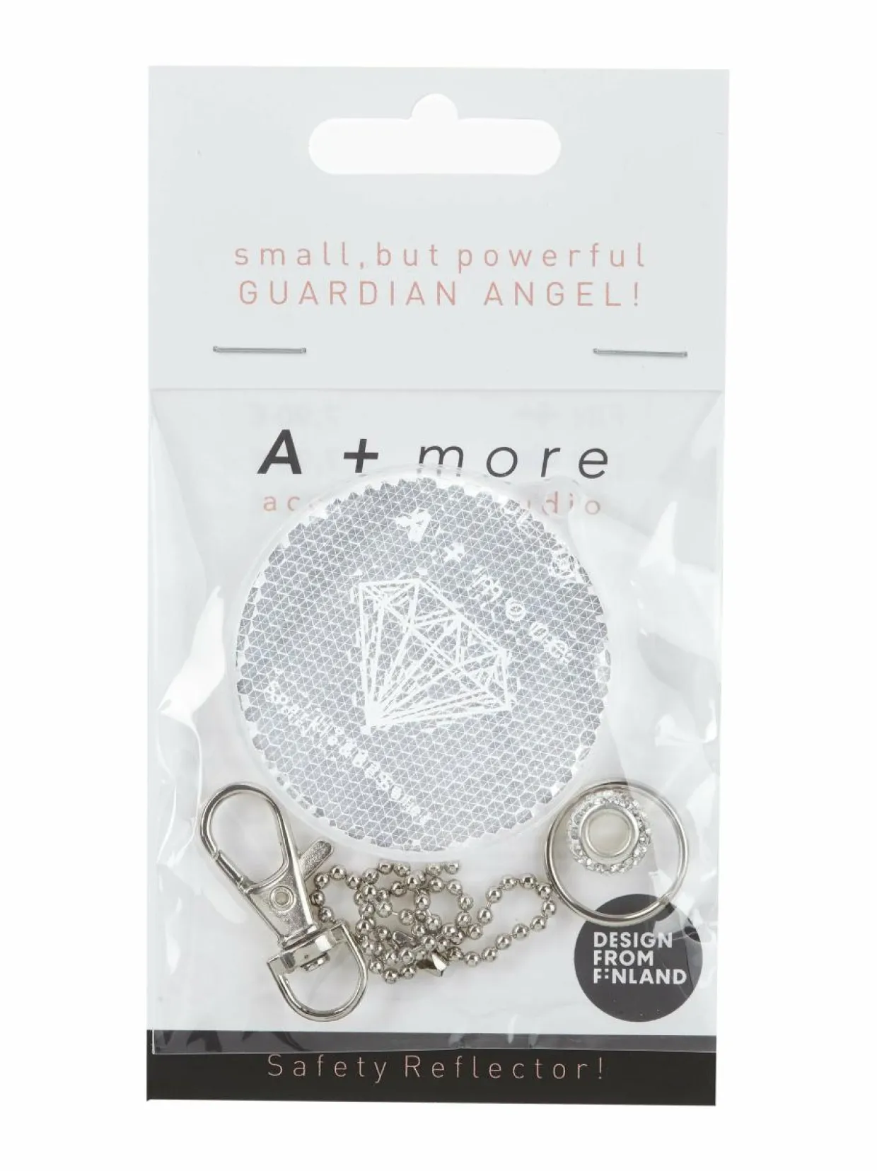 A+moren heijastimen mukana on kolme erilaista kiinnitysvaihtoehtoa sekä pieni kimaltavin koristein somistettu rengas, jonka voi liittää kokonaisuuteen. Tyylikäs heijastin parantaa näkyvyyttäsi ja turvallisuuttasi, ja se on helppo kiinnittää esimerkiksi takkiin, laukkuun tai lastenvaunuihin