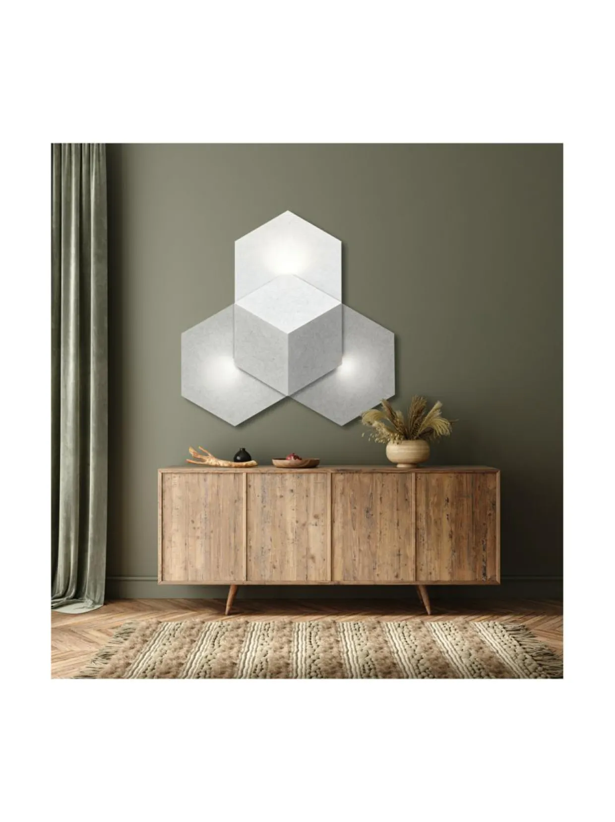 Heksagon valoelementti on ainutlaatuinen akustiikkapaneeli, joka luo valollaan ihanaa tunnelmaa tilaan. Siinne Heksagon valoelementti sopii hyvin käytettäväksi kaikkiin kodin tiloihin esimerkiksi portaikkoon tai olohuoneeseen. Heksagon 3 harmaasävyt sisältää 3 kpl toisiinsa liitettävää valoelementtiä, jotka voi yhdistää toisiinsa tilaan sopivalla tavalla. Setissä on 1 kpl valkoinen (taittuu hiukan harmaaseen), 1 kpl vaaleanharmaa (NCS S 2000-N) ja 1 kpl harmaa (NCS S 4000-N) valoelementti.