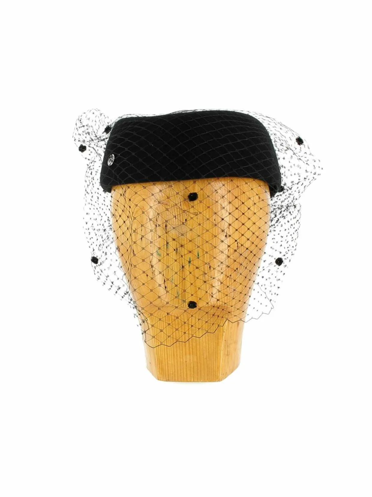 Näyttävä hattu villakankaasta. Hattua peittää ohut verkkokangas.