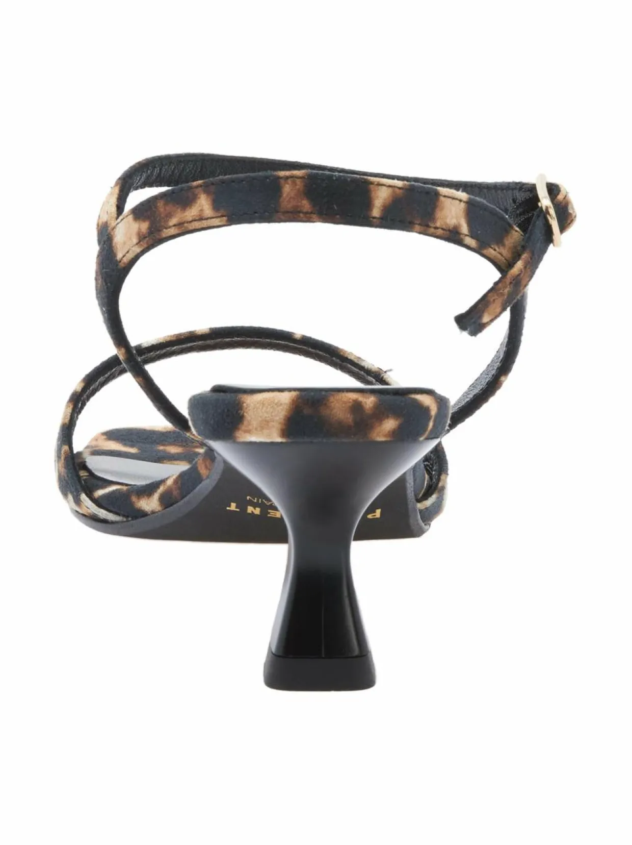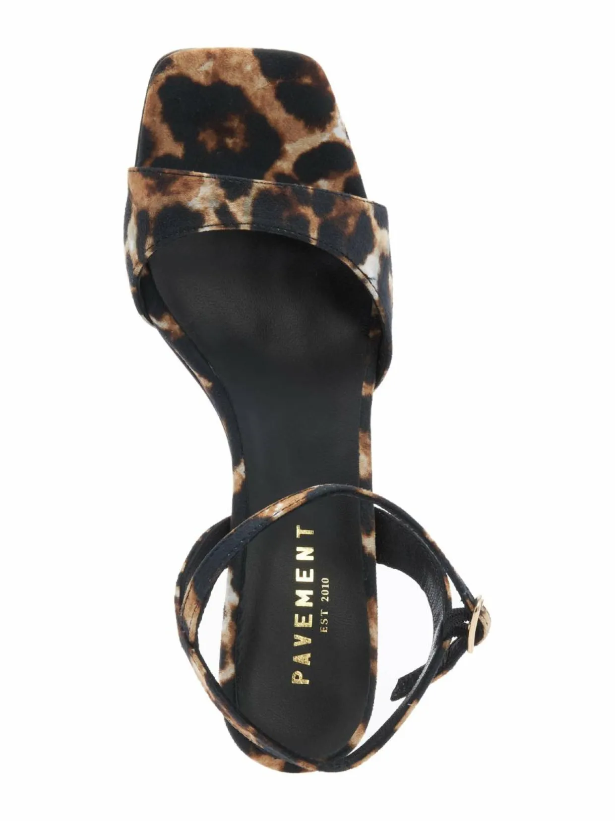 Pavementin Helma-sandaaleissa on leopardikuvioitu tekstiilipäällinen ja muotoiltu korko. Kenkien pohjallinen on nahkaa ja ulkopohja Thunit-materiaalia, joka on sekoitus kumia ja synteettistä materiaalia. Mallissa on elegantit, neliömäiset kärjet ja kiinnitys soljella, joka pitää kengät hyvin paikoillaan. Koron korkeus on 5 cm koossa 37. Valmistettu käsin Espanjassa.