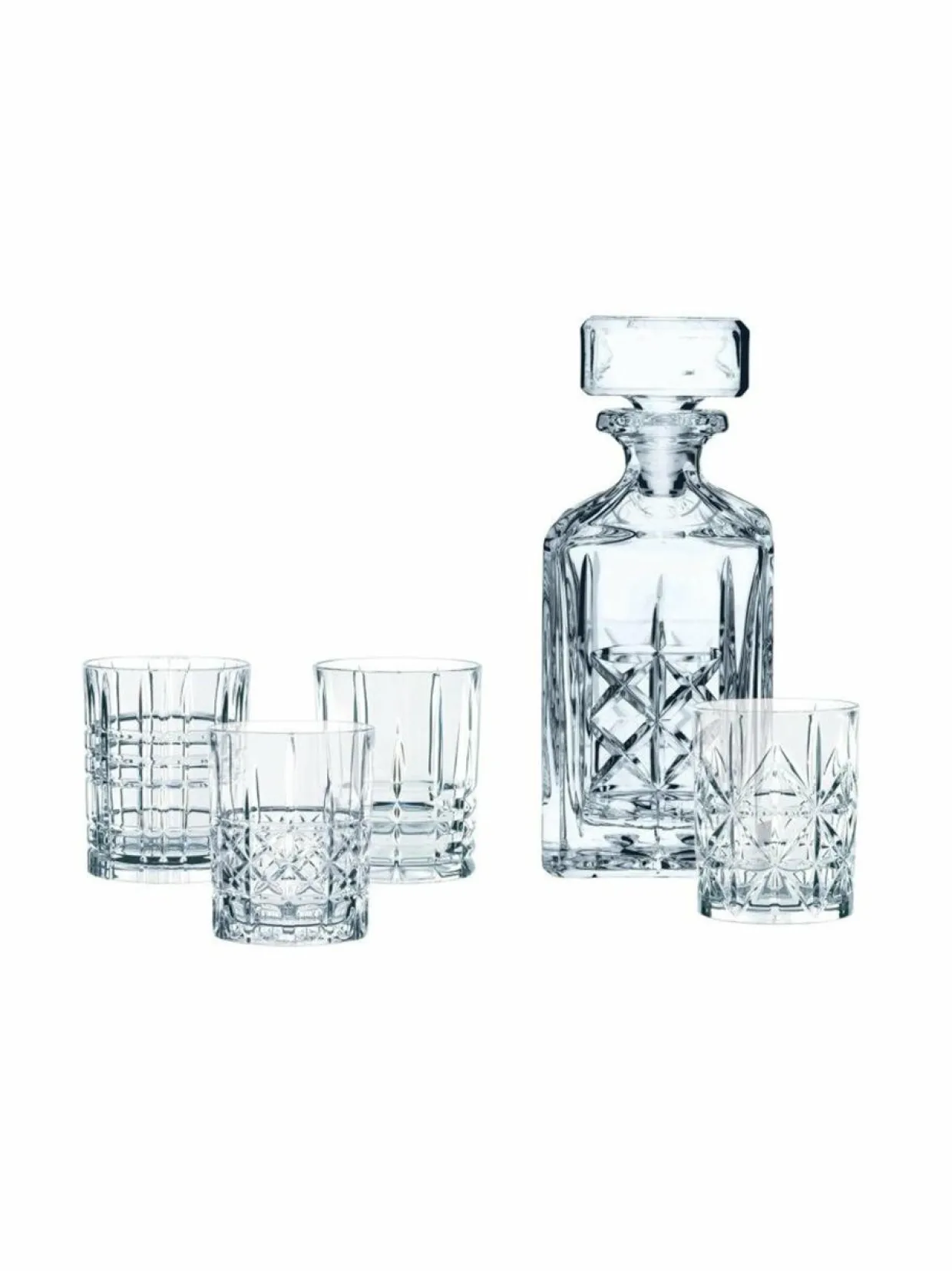 Settiin kuuluu kristallilasista valmistettu viskikarahvi ja neljä tyylikästä Hihgland-viskilasia, joissa jokaisessa on erilainen ja näyttävä, valoa taittava kohopinta. Kaunis kristallilasi soveltuu viskin lisäksi erilaisille cocktail-juomille.