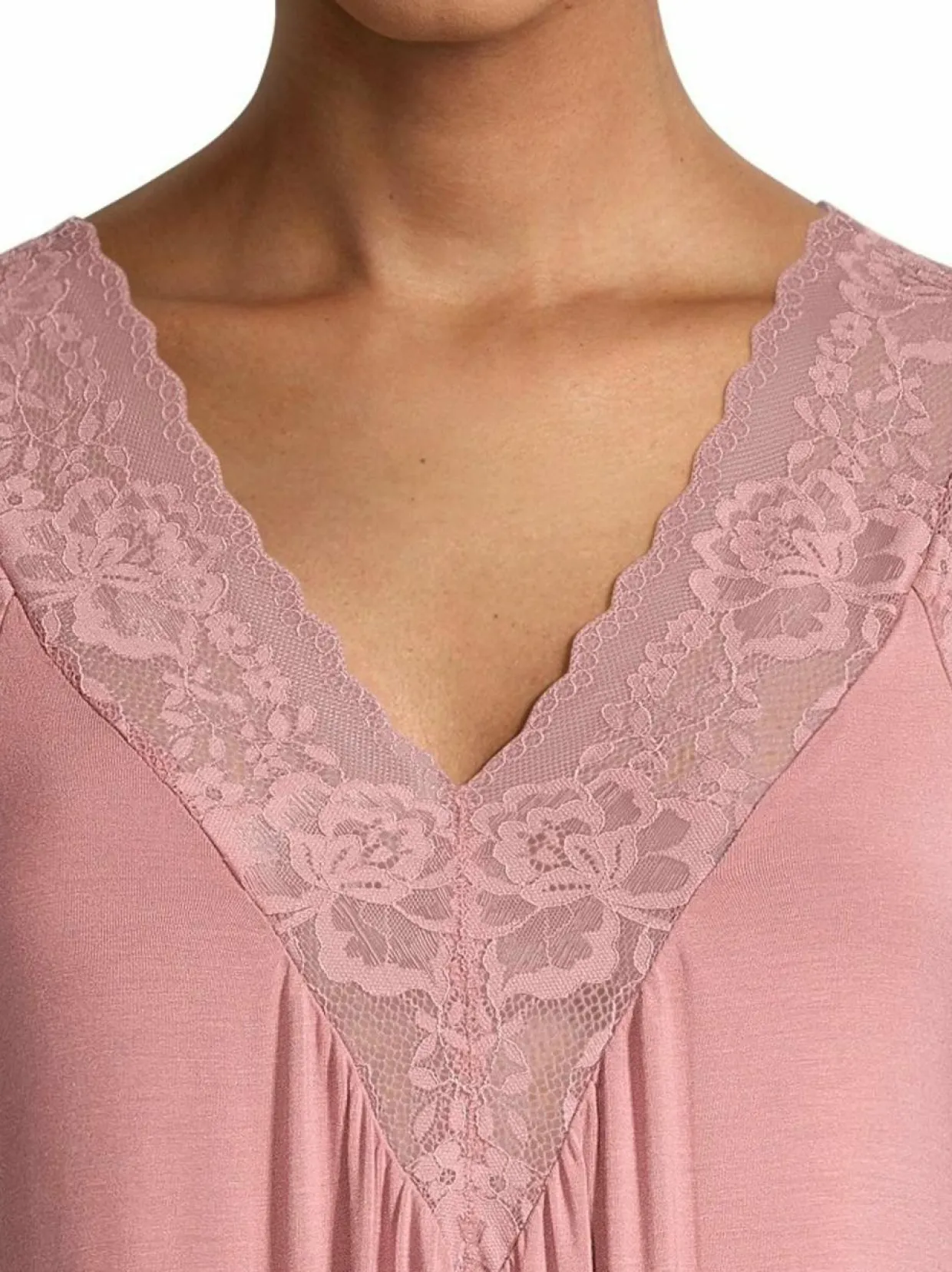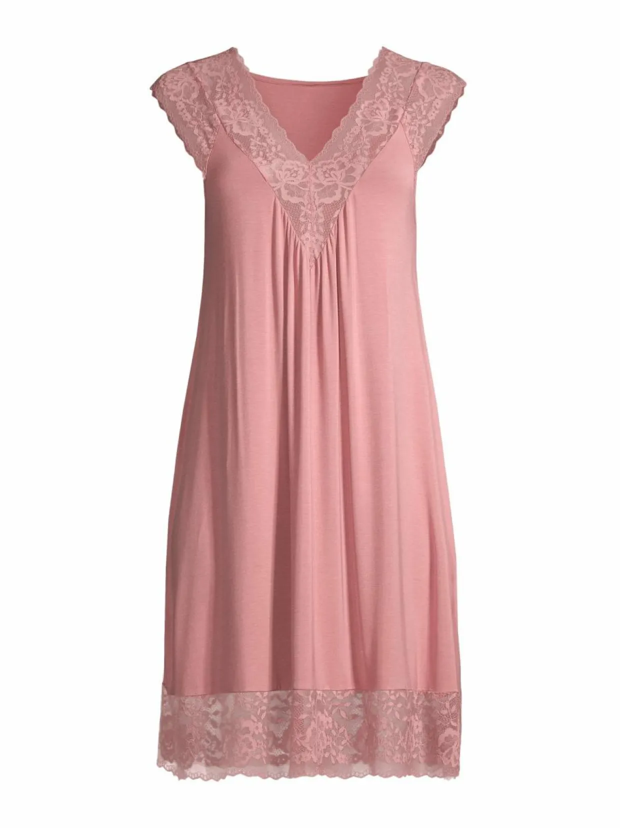 Damellan hihaton yömekko on valmistettu miellyttävän viileästä Ecovero-viskoosista, johon on lisätty elastaania tuomaan joustoa. Mekon pääntiessä, olkapäillä ja helmassa on läpikuultavat pitsipaneelit. Mallissa on syvään uurrettu V-pääntie.