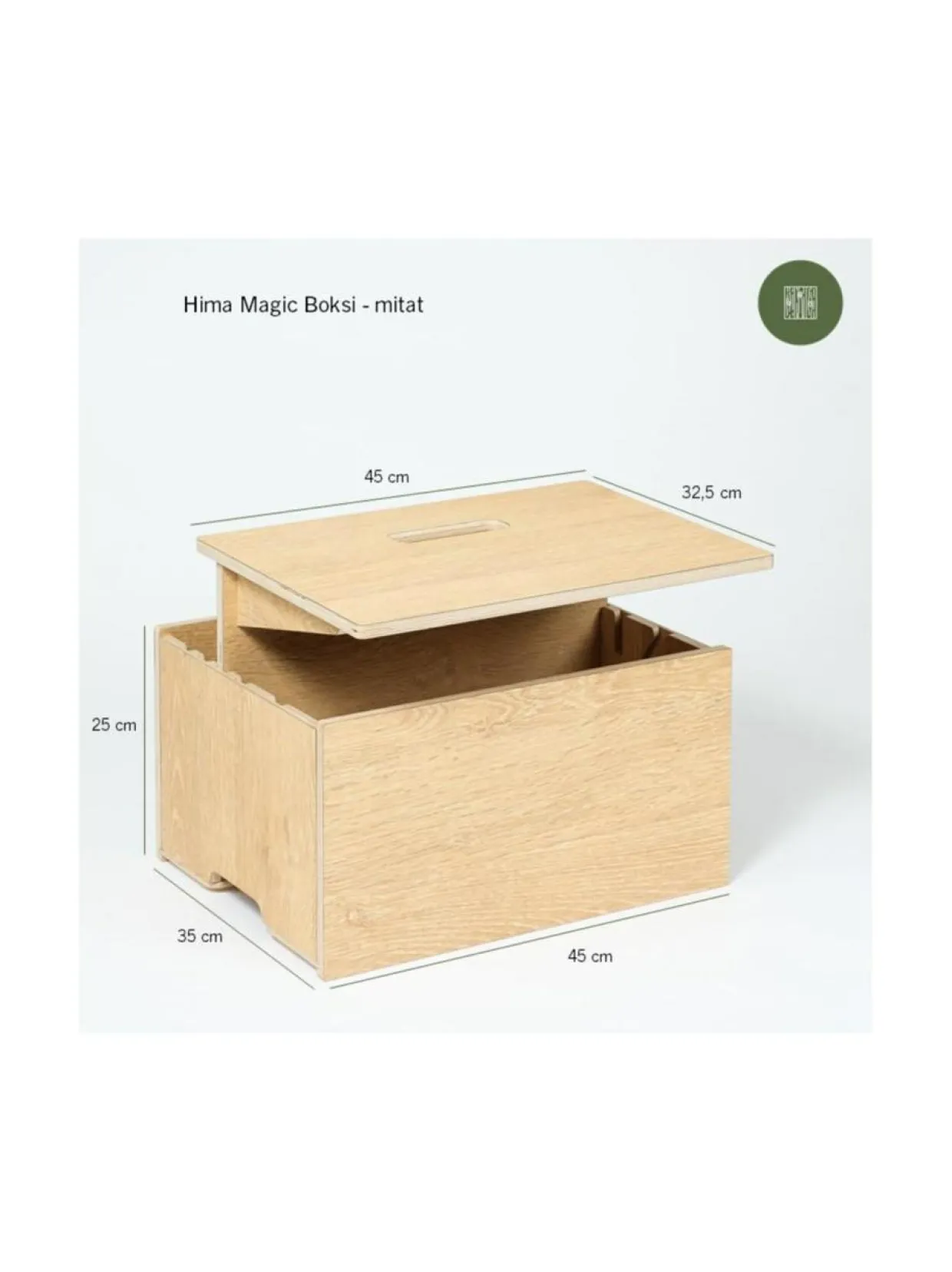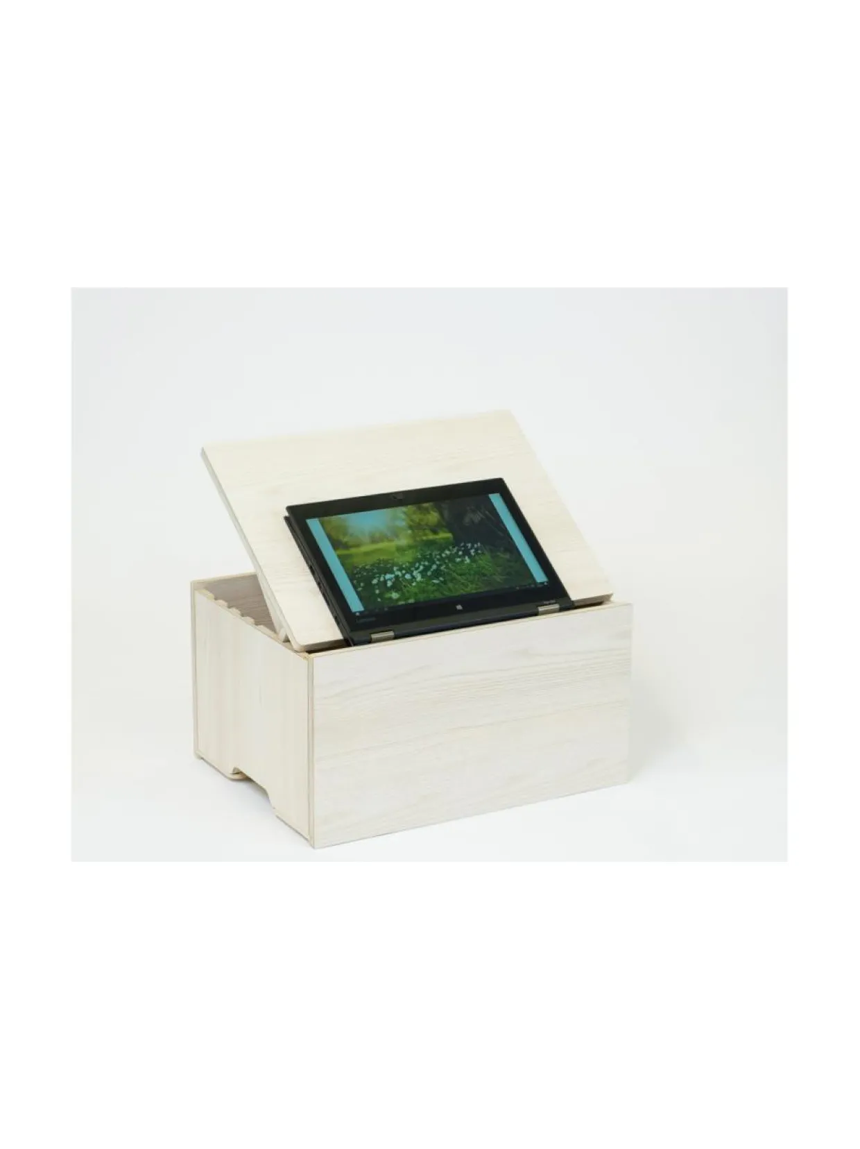 Fiksumpi, ekologisempi ja tehokkaampi tapa työskennellä. Magic Boksi on patentoitu suomalainen innovaatio. Se on loistava etätyön ergonomiatuote jota voit käyttää työskentely- ja säilytysratkaisuna sekä osana kotisi sisustusta. Magic Boksin avulla parannat läppärityöskentelyn ergonomiaa ja käytät sitä myös moneen muuhun tarpeeseen. Tässä laatikossa voit säilyttää johdot, laturit ja tietokoneen tai muita esineitäsi. Kannen, joka on samalla työtaso, korkeutta voidaan säätää neljään eri korkeuteen ja myös kallistettuna käyttää lukutelineenä tietokoneelle tai tabletille. Tuote on valmistettu Suomessa 14 mm paksusta kestävästä koivuvanerista, joka on laminoitu. Materiaalit ovat suunniteltu siten, että tuote kestää kulutusta.