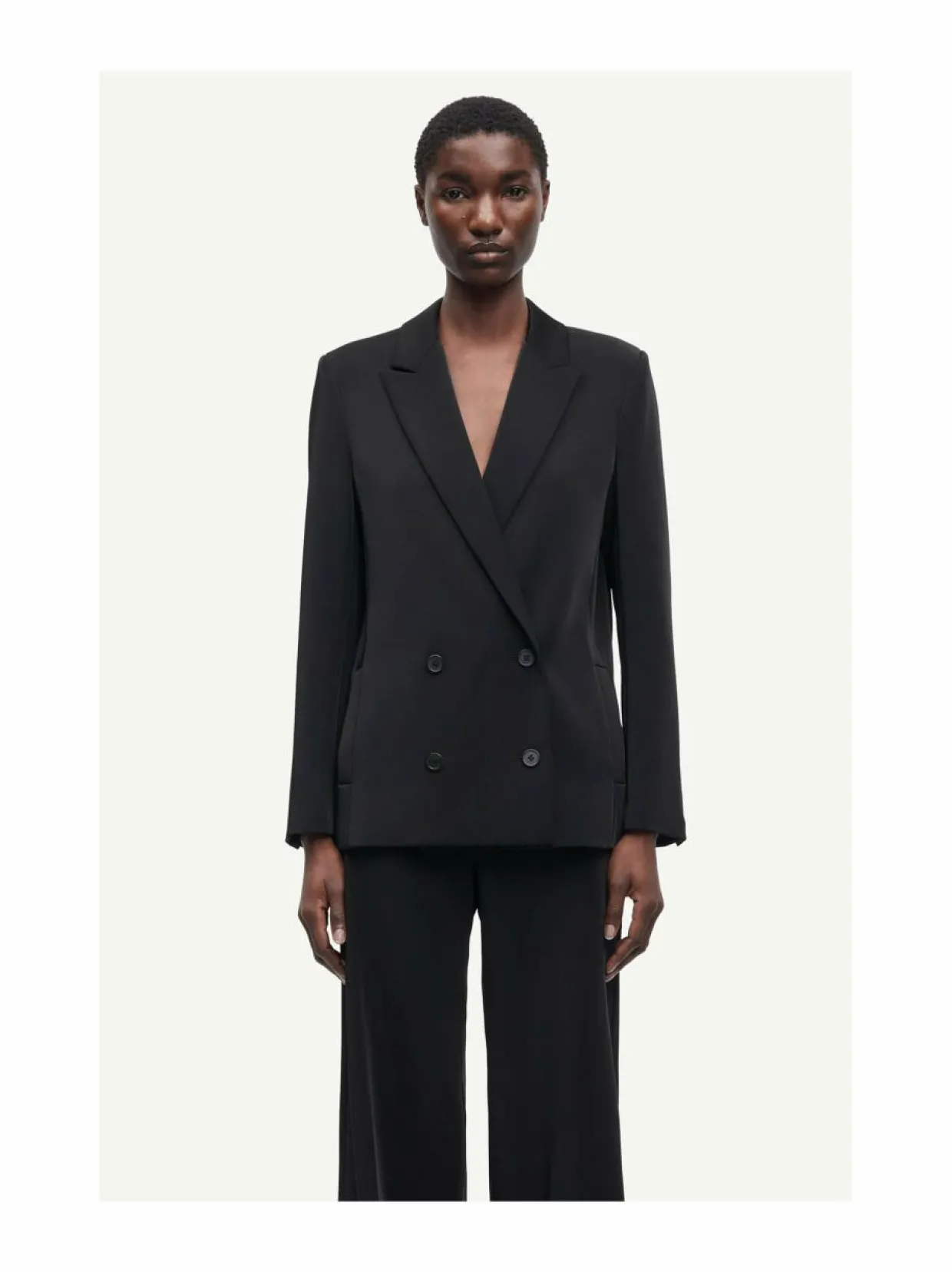 Materiaali94 % polyesteri, 4 % elastaani Hoito-ohjeetKemiallinen pesu VäriCLR000021 BLACK Avainsanatkaksirivinen bleiseri, bleiseri naiset, Samsoe Samsoe
