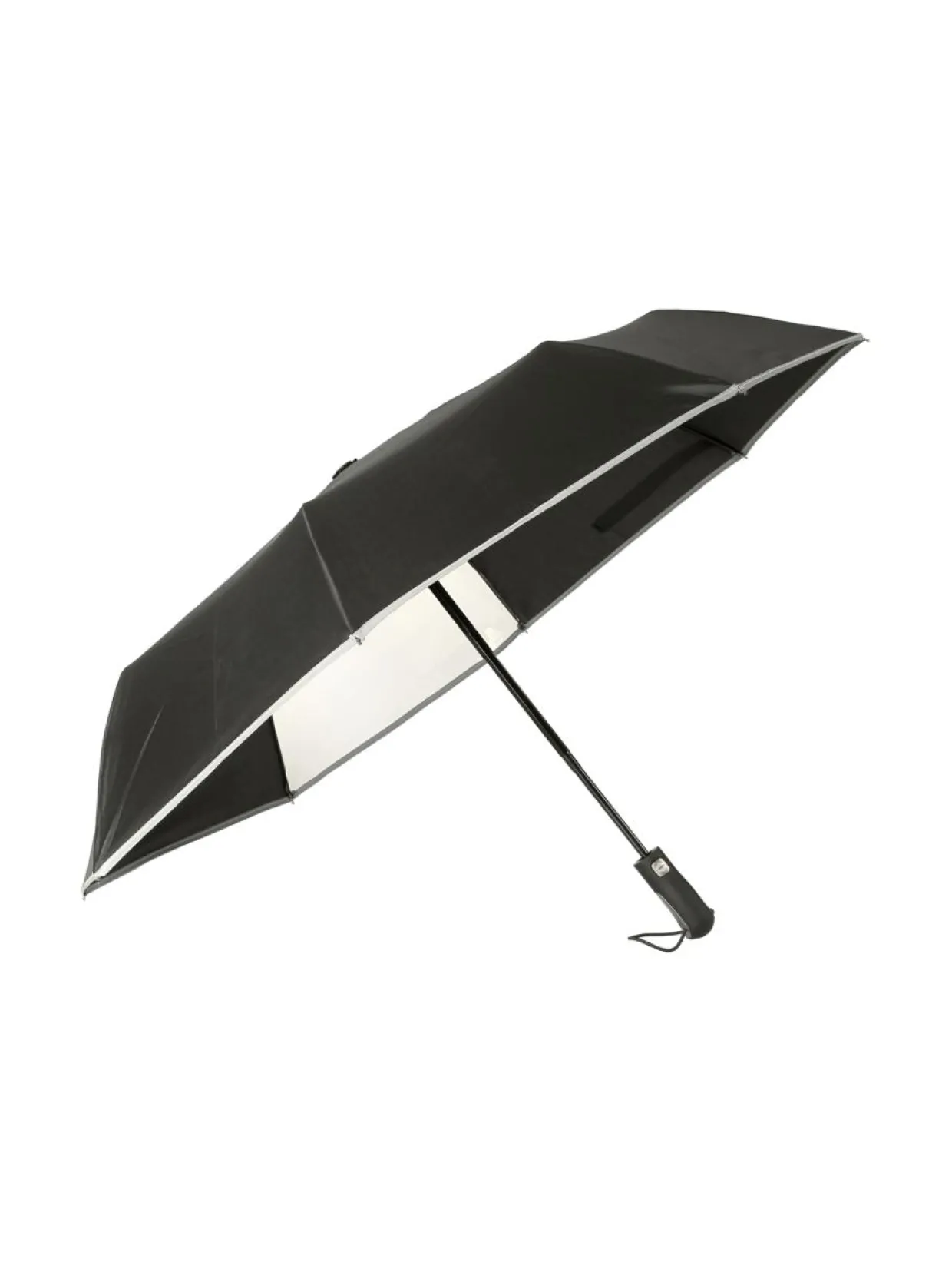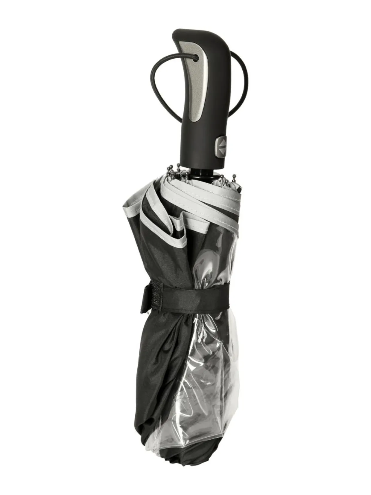 Huomio-sateenvarjo on kompaktin kokoinen varjo, jossa yksi lohkoista on läpinäkyvä. Ikkunan ansiosta näet kadulla kulkiessasi eteesi vaivatta pahemmassakin viimassa, vaikka varjoa pitäisikin tuulen vuoksi kallistaa eteenpäin. Varjon alareunaa kiertää turvaa antava heijastava nauha, jonka ansiosta autoilijat näkevät myös sinut. Vain napin painalluksella tapahtuva automaattinen nopea avautuminen ja sulkeutuminen puolestaan on ominaisuus, jota arvostaa etenkin sadekuuron yllättäessä tai kun on tarve hypätä nopeasti autoon. Varjo taittuu pieneen tilaan ja kulkee kätevästi mukana – lenkillä varustettu tukeva kahva viimeistelee käyttömukavuuden.
