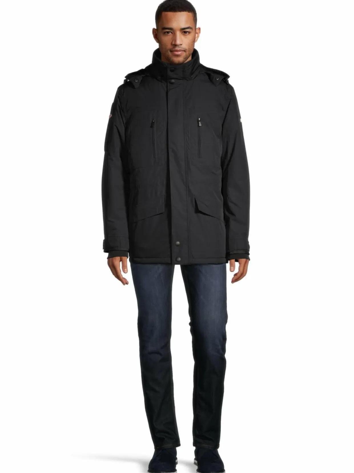 Suoramallinen miesten toppatakki hupulla. Viisi ulkotaskua, yksi matkapuhelintasku, kaksi vetoketjullista sisätaskua ja tasku vuorauksessa tarjoavat erilaisia mahdollisuuksia henkilökohtaisten tavaroiden turvalliseen säilyttämiseen. Vuorattu huppu on irrotettava. Kiinnitys kaksisuuntaisella vetoketjulla.
