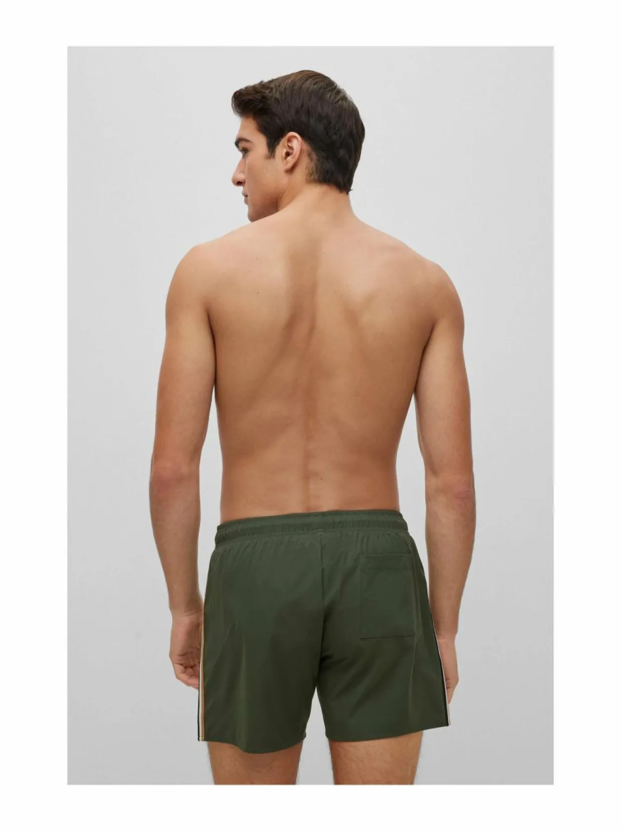 Uimashortsit, joiden sivuja koristavat raidat. Takana kiinniommeltu tasku. Materiaalina kierrätyspolyesteri.
