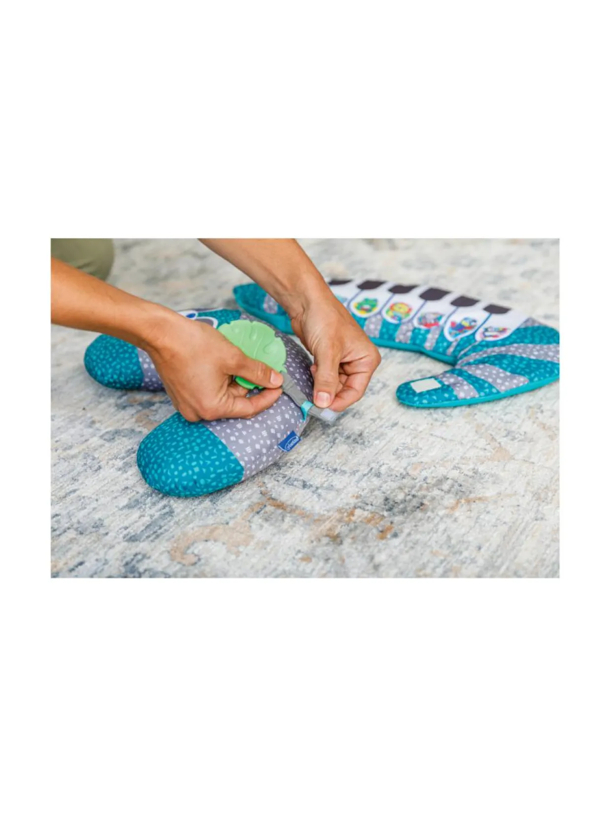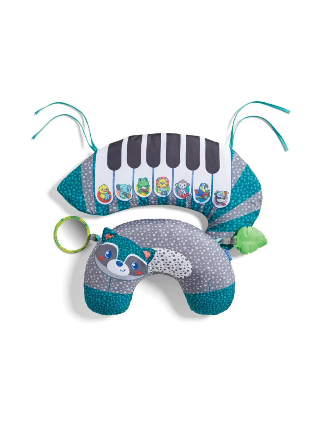 Tämä tyyny kehittyy lapsesi rytmissä. Tyynyä voi käyttää kolmella eri tavalla. Kiinnitä pehmopiano lapsen sängyn pinnoihin, jolloin vauva voi maata vatsallaan tai istua leikkiessään sillä. Samalla vauva harjoittaa kaulan ja pään lihaksia. Pehmopianon lisävarusteet kehittävät lapsen uteliaisuutta ja stimuloivat lasta. Piano kannustaa ja rohkaisee vauvaa liikkumaan ja painelemaan pianon koskettimia uusien äänien löytämiseksi. Pehmopianon tekniset ominaisuudet: 20 erilaista melodiaa ja ääntä, irrotettava peili, silikonista valmistettu pururengas, pesukarhun näköinen vatsatyyny, joka tarjoaa erinomaisen tuen vauvan maatessa selällään tai vatsallaan. Tuote toimii 3 x AA-paristolla (paristot eivät sisälly toimitukseen).