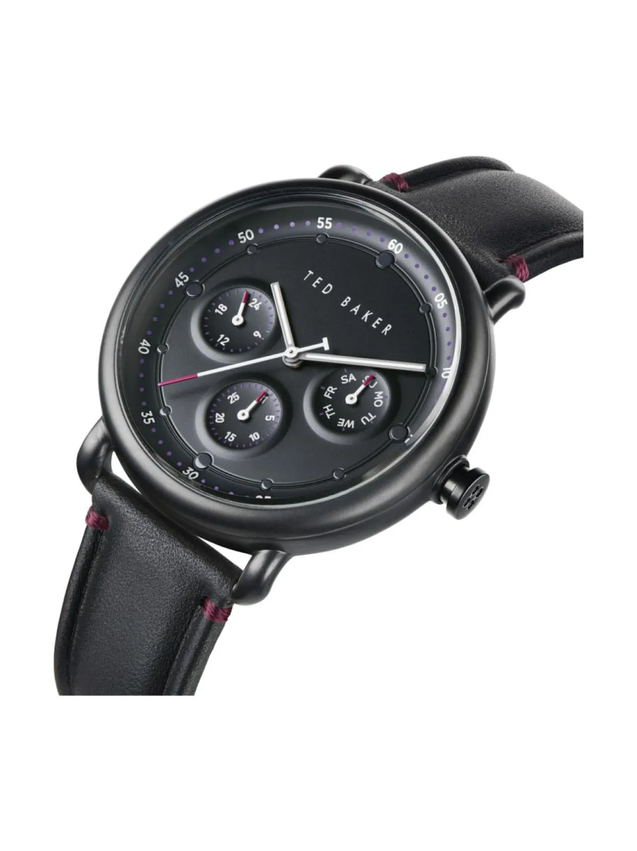 Ted Baker IvyBrid 43mm rannekello tuo sporttisen lisän asukokonaisuuteen. Kellon musta runko on valmistettu ruostumattomasta teräksestä. Sen leveys on 43mm ja paksuus on 12mm. Rannekkeena tässä mallissa on musta nahkaranneke. Mustassa kellotaulussa on 24 tunnin näyttö sekä pienemmät näytöt viikonpäiville ja päivämäärille. Kellossa on mineraalilasi ja kvartsikoneisto. Kellon vesitiiviys on 5ATM. Ted Baker kelloilla on 2 vuoden takuu.